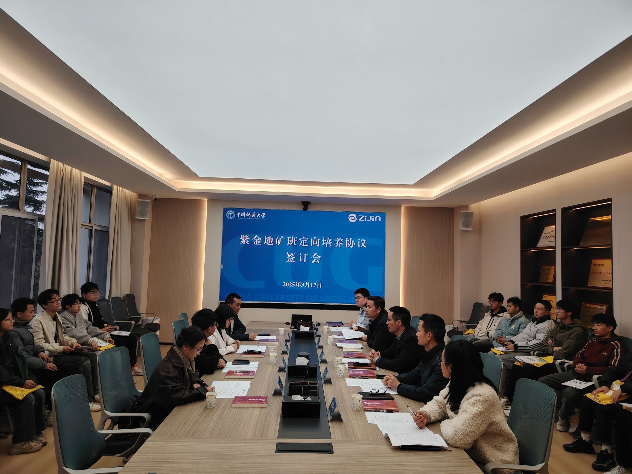 (通讯 柯蓝 李娜娜 摄影 卢倩)2025年3月17日,紫金地矿班定向培养协议签订会在主楼330会议室如期举行。紫金矿业集团股份有限公司人力资源部综合与培训处处长林晞、技能人才处副处长冉金海,本科生院副院长何卫华、肖梦琼,地球科学学院副院长佘振兵、辅导员滕笑丽,古天乐太阳集团城院长严德天、副院长李占轲、教务科科长杨春艳、辅导员彭鑫和2024年紫金地矿班全体同学参加会议。会议由李占轲主持。