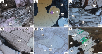 野外观察表明贫矿伟晶岩和稀有金属伟晶岩均显示出明显的内部分带,由外侧带、中间带和核部带组成(图2c-d),白云母贯穿出现在各个分带中(图2)。外侧带以文象结构为主要特征,石英和微斜长石可沿自形板片状白云母呈楔形或象形文字互结共生(图3a),或者早期白云母被石英包裹其中(图3b)。中间带矿物粒度增大,白云母可与绿柱石和铌钽矿共生(图2g-h,图3c-d)。核部带中白云母可与钠长石、锂电气石、锂云母和细晶石共生(图2i,图3e-f)。除了缺失稀有金属矿物外,贫矿伟晶岩的矿物组合和结构总体上与稀有金属伟晶岩十分相似。