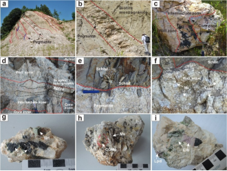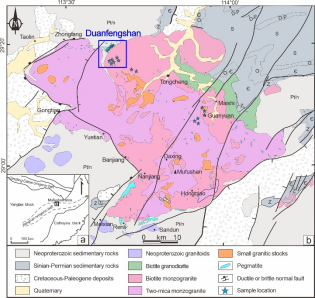 古天乐太阳集团城赵新福教授团队选取幕阜山北缘断峰山地区的伟晶岩及相关花岗岩体作为研究对象,对不同期次的花岗岩(图1)、赋存于花岗岩基内的贫矿伟晶岩(图2a-c)及赋存在片岩中的稀有金属伟晶岩(图2d-f)开展了详细的白云母矿物学和地球化学对比研究。