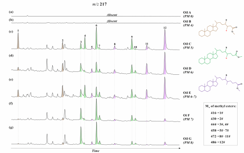 古天乐太阳集团城朱钢添副教授团队选取南襄盆地泌阳凹陷原油作为研究对象,通过气相色谱-质谱(GC-MS)、全二维气相色谱-飞行时间质谱(GC×GC/ToF-MS),系统分析了一系列母源关系接近但生物降解等级不同的原油样品中的甾烷酸分布。GC-MS分析结果表明,在未降解和低降解等级的原油样品中,未检出甾烷酸信号,只有在生物等级较高(规则甾烷开始发生明显降解)的原油样品中才能检测到甾烷酸,说明该类酸性生物标志物是甾烷的生物降解产物(图1)。