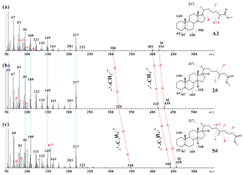 利用全二维气相色谱-飞行时间质谱分析技术,研究团队获得了这些甾烷酸的质谱图。基于质谱碎片“拼接”甾烷酸分子结构,发现这些甾烷酸与已报道的甾烷酸相比,具有异常高的碳数,最高碳数达到32。而本研究中被生物降解的规则甾烷的碳数分布是27~29,这意味着甾烷在被微生物氧化形成甾烷酸的过程中发生了碳链延长。进一步对比甾烷酸及其对应的甾烷前体分子结构,发现甾烷在被生物降解形成甾烷酸过程存在侧链末端延长1~3个亚甲基单元的现象。