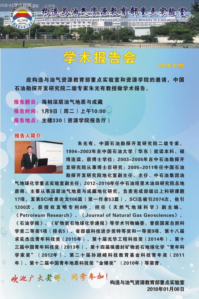 [1月9日]构造与油气资源教育部重点实验室2018-1期:朱光有学术报告