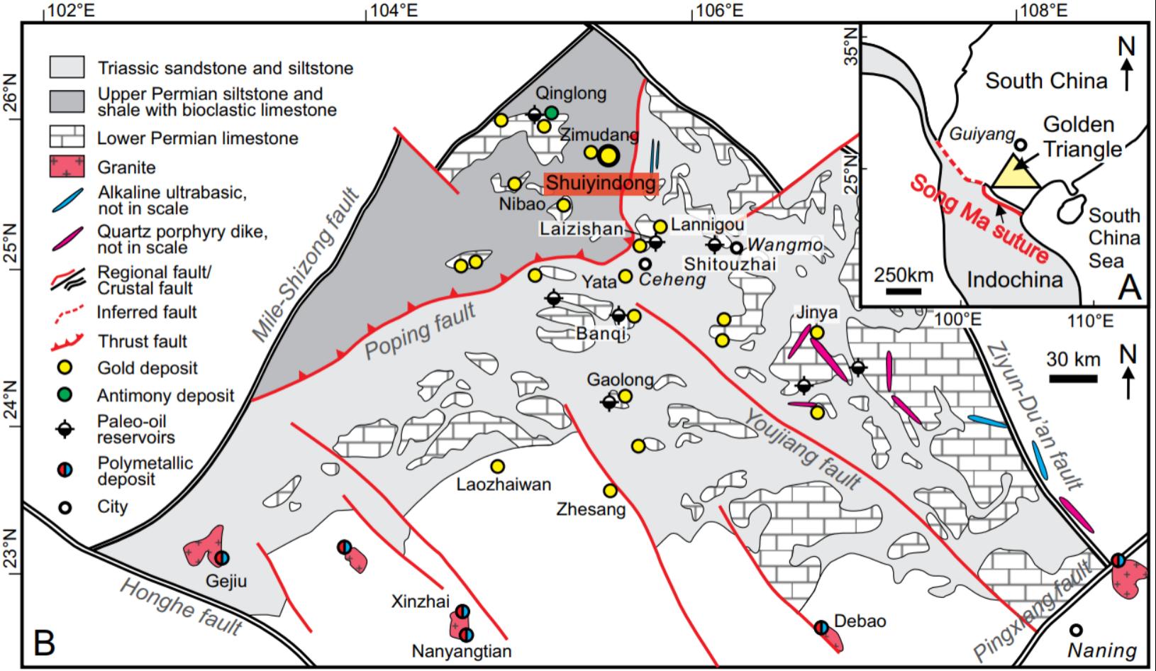 我国西南右江盆地中发育了大量赋存于沉积岩中的金矿床(图1),其矿化地质特征与卡林型金矿床具有诸多相似之处,被认为是目前除了美国内华达地区以外世界上最大的卡林型金矿矿集区。近期,中国地质大学(武汉)李建威教授团队的靳晓野助理研究员利用稀有气体同位素和LA-(MC)-ICP-MS方解石U-Pb测年法分别对该地区的典型金矿床开展了矿床地球化学示踪和成矿年代学研究,旨在为区域及其他地区卡林型金矿床的矿床成因研究提供新的思路或借鉴。