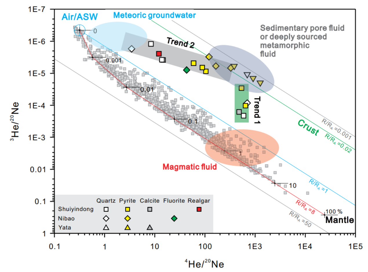 图3. 水银洞、泥堡和丫他金矿床不同热液矿物流体包裹体3He/20Ne vs. 4He/20Ne相关性图解显示卡林型金矿床的初始成矿流体具有岩浆来源特征,成矿作用过程中先后与地壳浅部沉积岩中的孔隙流体或深源变质流体及循环大气降水发生了混合作用