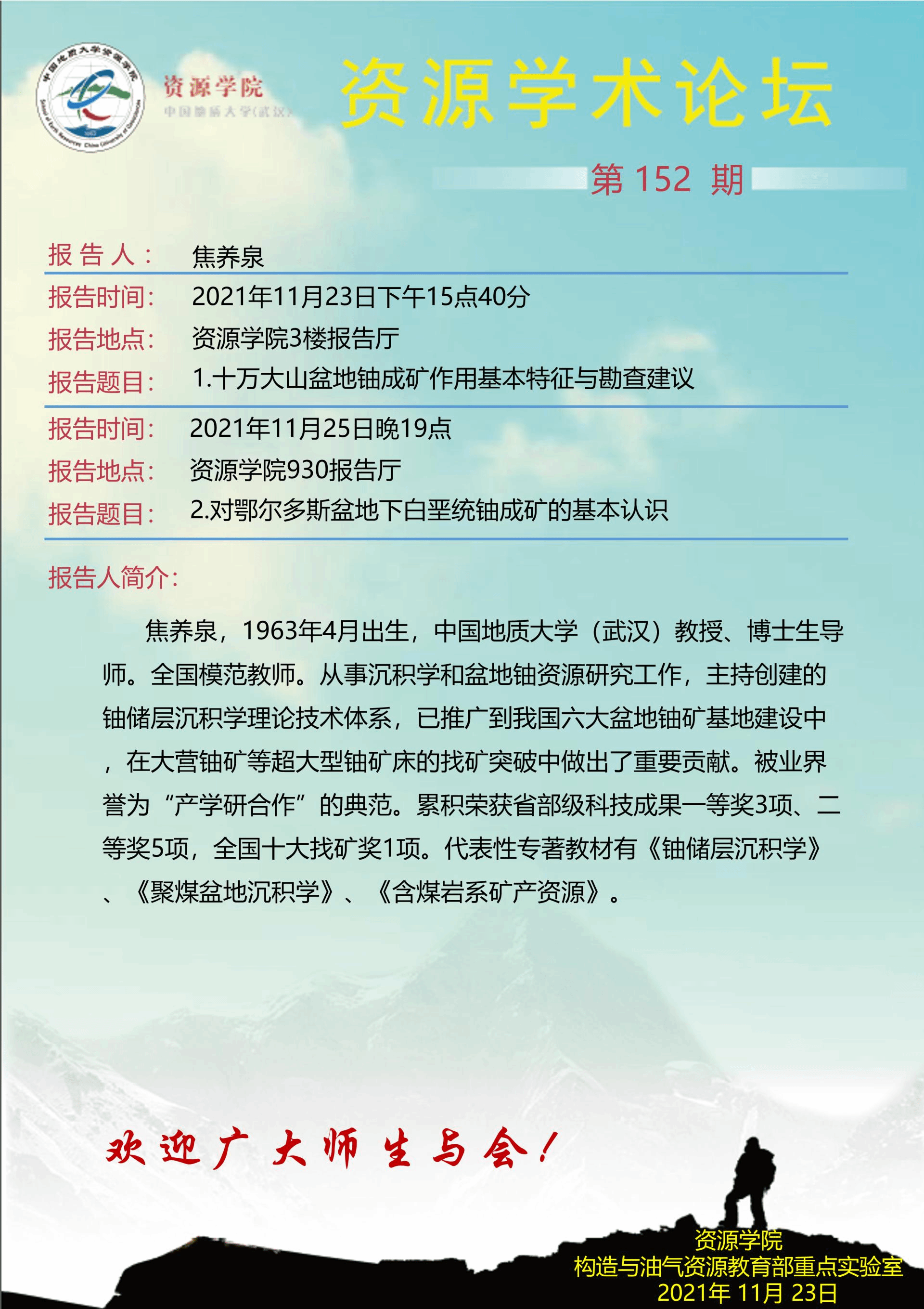 【11月23日、11月25日】第152期资源学术论坛:焦养泉学术报告