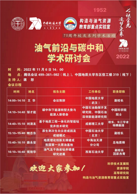 为深入学习贯彻习近平总书记关于能源资源工作的重要论述和习近平总书记给山东省地矿局第六地质大队全体地质工作者的重要回信精神,主动服务融入新一轮找矿突破战略行动和国家“双碳”战略,服务国家能源资源安全重大需求,在中国地质大学建校70周年校庆之际,举办“油气前沿与碳中和”学术研讨会,特邀行业內院士专家,聚焦油气前沿,抓住碳中和发展的关键机遇,开展油气和地热等新能源勘探开发理论和技术前沿研讨,推动有组织有前瞻性的研究和创新,为能源资源高效勘探开发提供理论与技术支持。