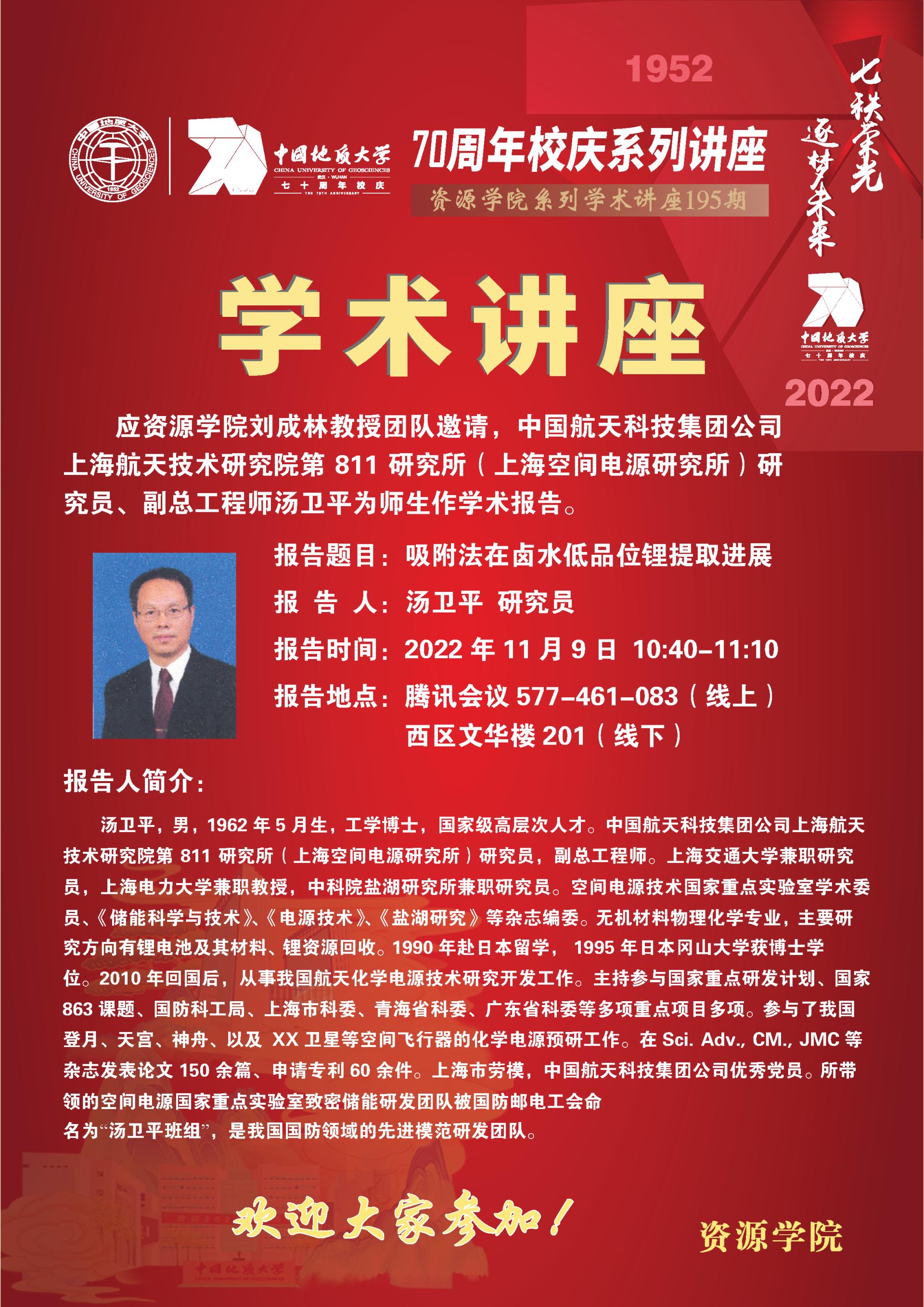 【11月9日】第195期资源学术论坛:汤卫平学术报告