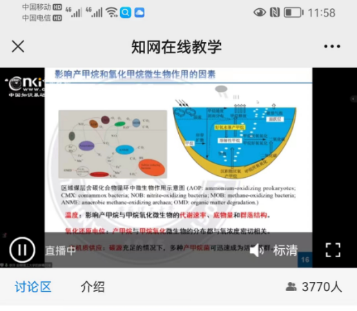 研讨会期间,各专家学者以“煤层气生物工程与碳减排”为主题,结合了自身的研究工作,进行了深入的探讨。吉林大学许天福教授、东北石油大学潘哲君教授、中国科学院大学余志晟教授、西安科技大学刘向荣教授、昆明理工大学张登峰教授,分别以“数值模拟在CCUS潜力和安全性评价的应用”、“二氧化碳在煤层中的封存研究”、“煤层气原位生物气化研究进展与现场应用方案探讨”、“新疆低阶煤的微生物降解研究”、“煤储层协同埋存富氧燃煤烟气关键组分与驱替煤层气基础研究”等为题作了专题报告。期间,还有来自中国矿业大学(北京)、太原理工大学、齐鲁工业大学、太原科技大学、 河南理工大学、西北大学、 安徽理工大学、中国矿业大学、煤与煤层气共采国家重点实验室等科研院所等15位专家依次做了主题或专题报告。研讨会现场学术氛围浓烈,线上直播平台反应热烈,最高峰有3700多人同时在线交流讨论。