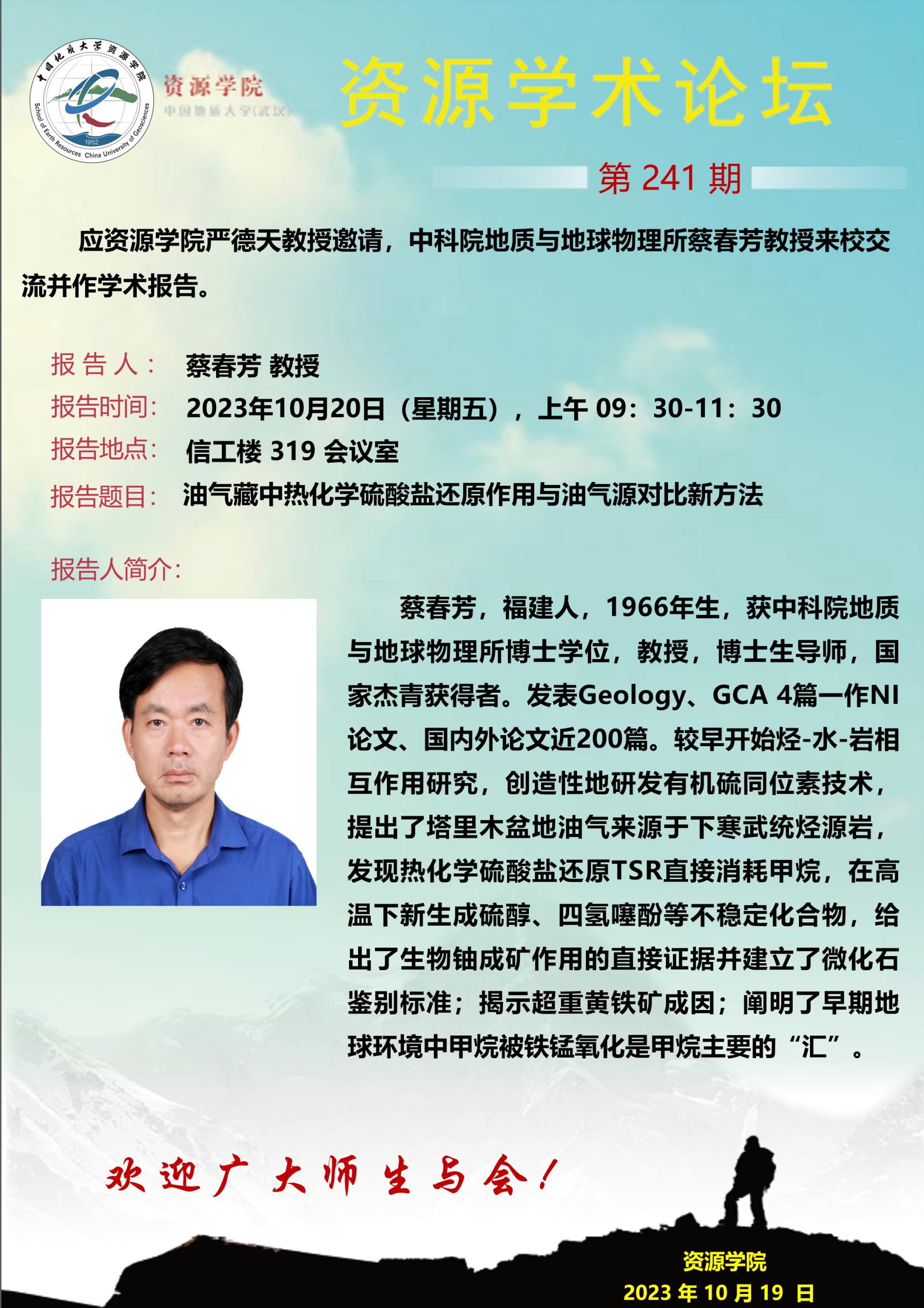 【10月20日】第241期资源学术论坛:蔡春芳学术报告