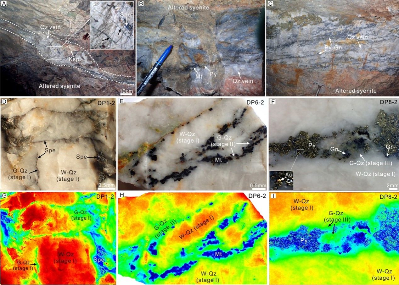 围绕以上研究问题,来自中国地质大学(武汉)李建威教授团队的范高华博士以河北东坪超大型金-碲矿床(~120吨金和~225吨碲)为研究对象,综合了不同共生阶段多世代石英的微结构特征、流体包裹体、微量元素地球化学以及原位氧同位素分析,为金成矿流体的来源和复杂演化提供了重要见解。这些结果还用于揭示导致金沉积的机制。最后讨论了该方法在追踪脉状金矿床中流体流动及其微观变化方面的潜在应用。所研究的三个石英脉样品取自Au-6矿区的70号矿体(图1a-1c),它们分别代表第I阶段(样品DP1-2)、第II阶段(DP6-2)和第III阶段(DP8-2)。这些样品均含有第I阶段的乳白色石英(图1d-1f)和细脉状的烟灰色石英(图1g-1i)。第I阶段的石英通常与镜铁矿共生,而第II阶段和第III阶段的石英则分别与磁铁矿和含金硫化物共存(图1e-1i)。