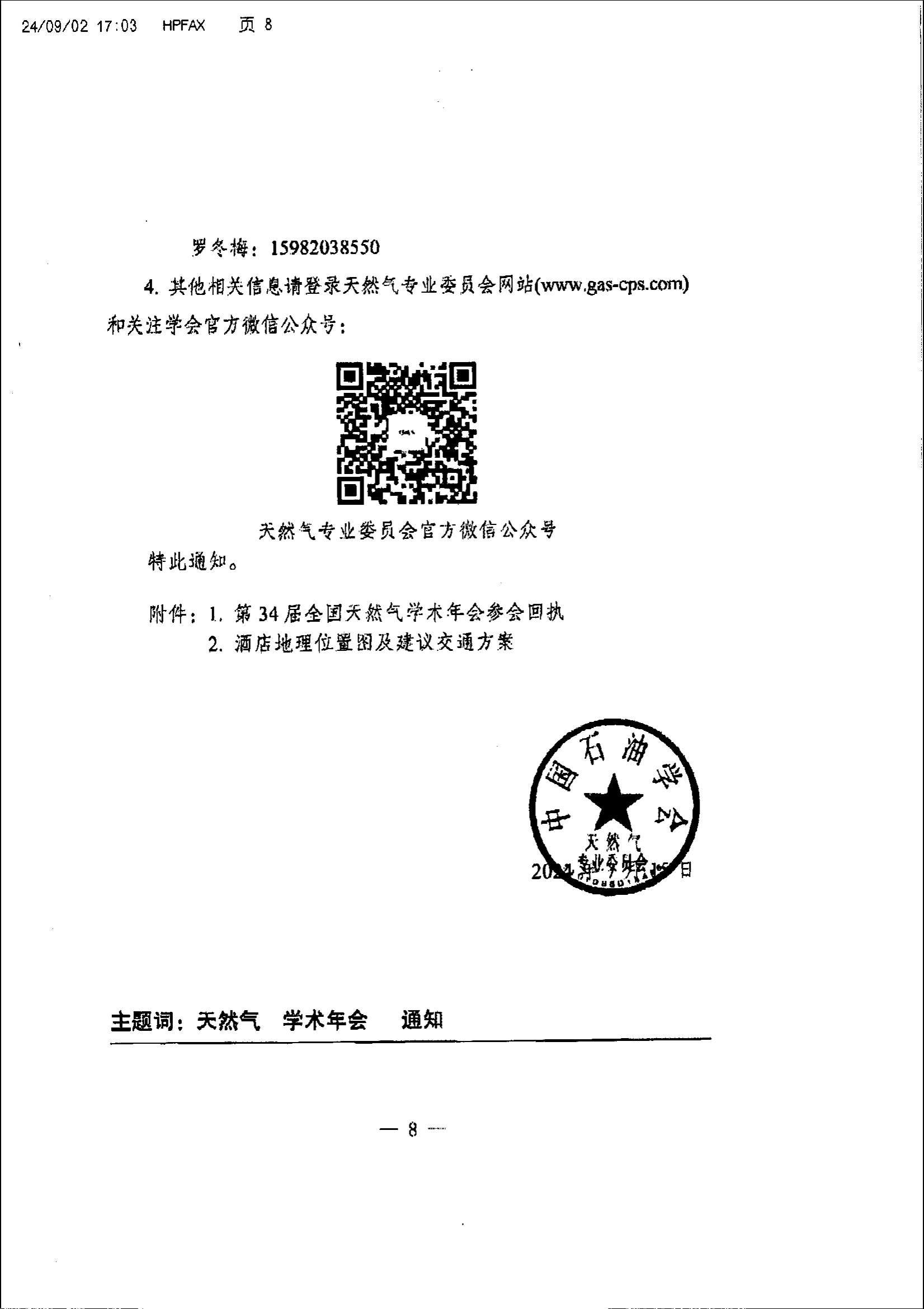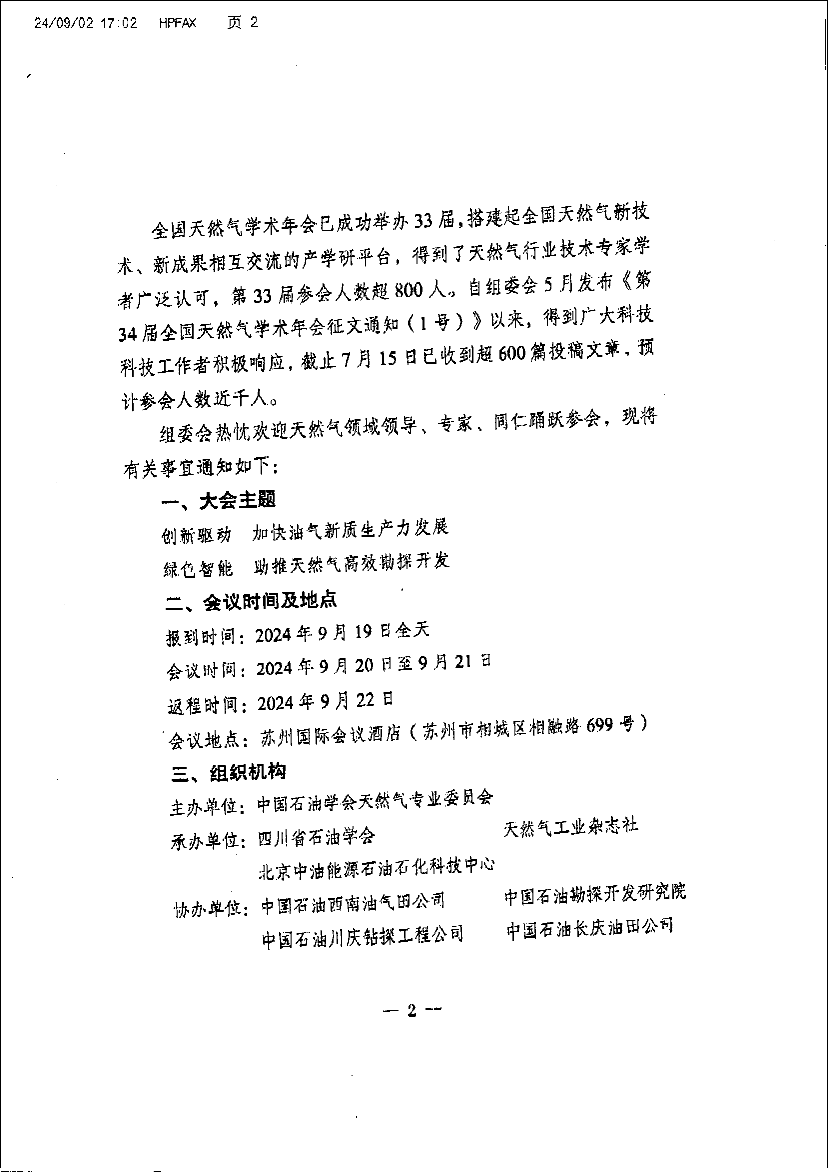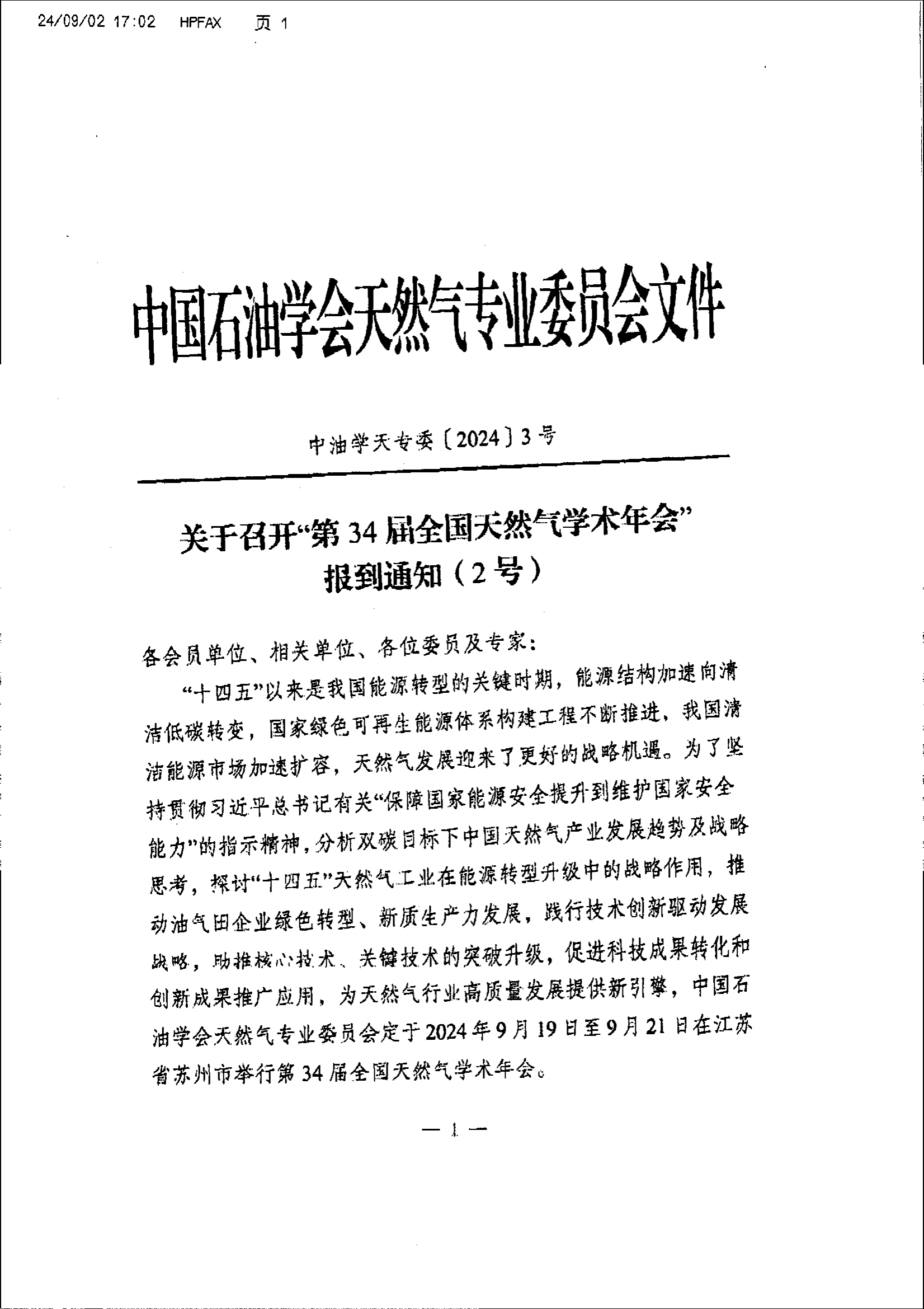 关于召开“第34届全国天然气学术年会”报到通知
