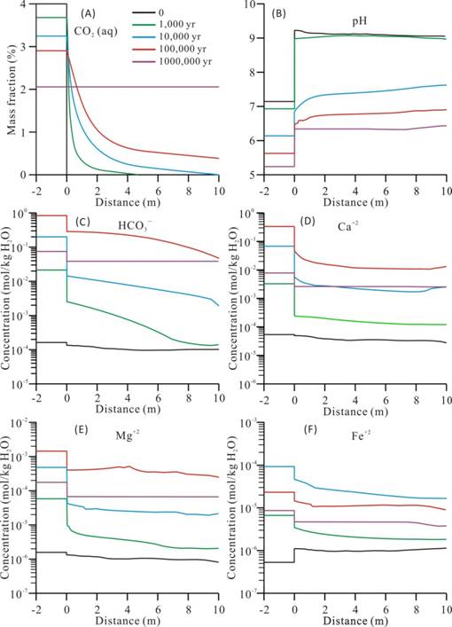 图1 砂-泥岩系统主要溶质离子浓度迁移变化(基于成岩数值模拟)