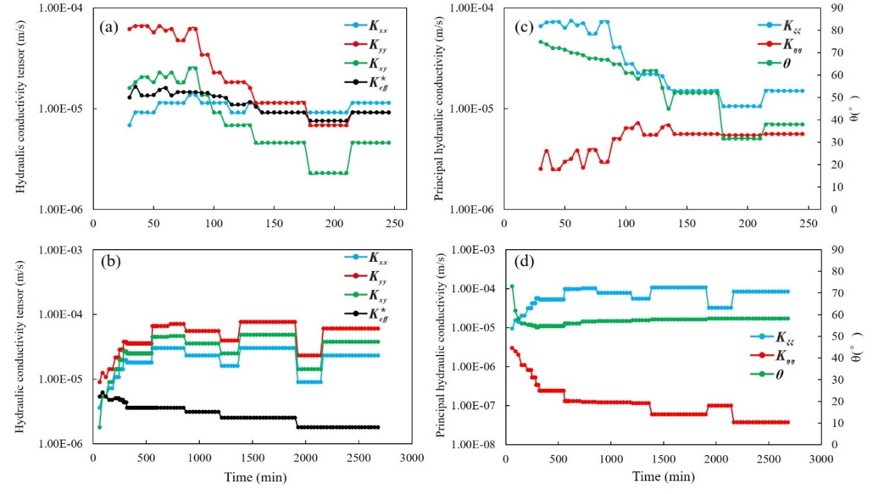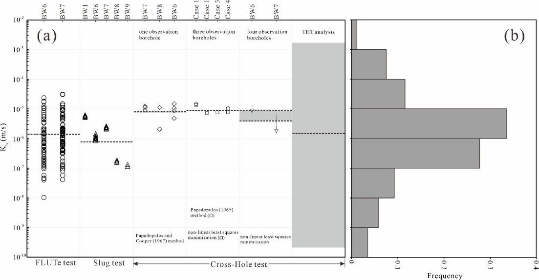 研究结果表明,跨井孔水力试验确定的K的各向异性与现场地质数据(露头和井下电视数据)一致。跨井孔试验得到的K值大于单井试验得到的K,说明井间裂缝连通性较好。此外,解析方法和数值反演结果均表明,在更大的尺度下测得的K值相比井间范围内的K值减小,这是由于渗透性较差的裂缝在更大尺度上占主导地位,这点也被瞬态水力层析数值反演的结果所证明,并和大尺度的地质背景吻合。总的来说,K从单孔增加到井间尺度,然后在更大尺度下减小,表现出非单调的尺度效应,这与前人研究认为K值随尺度单调变化不同。本研究是对渗透系数尺度效应的有益补充,也对不同研究尺度下如何选择合理的K值进行数值模拟实验提供参考。