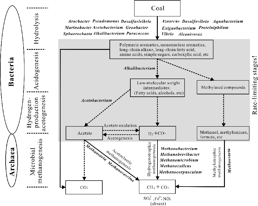 米泉矿区产甲烷生物降解的简化示意图