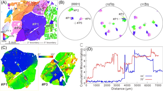 伟晶岩中的电气石EBSD测量结果则显示出较多的不同,比如可见丰富的亚颗粒边界(图4A),颗粒内部的取向差较大(可达8°,图4D)。此外,虽然#P3和#P4颗粒未生长在一起(图4A),但是在晶体取向散点图中显示,#P3和#P4具有几乎相同的取向(图4B),表明它们在某次构造事件中的运动具有相同的旋转轴,另外#P1和#P2沿{101(_)0}面平行,表明它们在某次构造事件中运动中分享共同的面,依次类推,可以得出,#P1,#P2,#P3,#P4之前可能为一个颗粒,而受到后期的构造时间影响,而发生破裂形成不同的颗粒。错那洞淡色花岗岩(20 Ma)未受到明显外部构造作用影响(图1A),从而可以判定破裂发生的时间应该在20 Ma之前。这些破裂形成的电气石颗粒又被错那洞淡色花岗岩(20 Ma)所捕获。