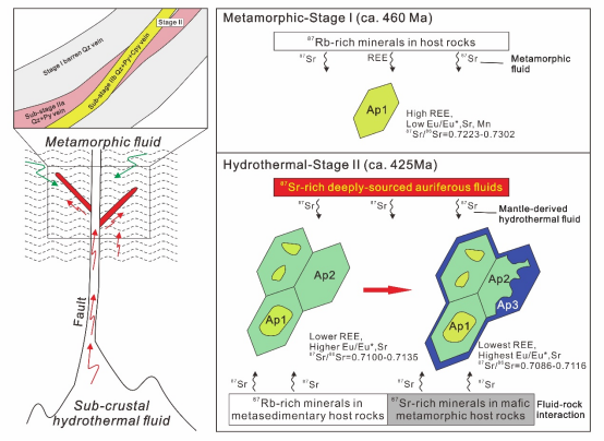 本研究表明,磷灰石是造山型金矿床成矿体系中变质-热液演化的有效“矿物探针”,其精细结构-年代学-元素-同位素特征可以有效约束造山型金矿床成矿体系的成矿时代和变质-热液成矿过程。该研究成果发表在地质学国际知名期刊《Geological Society of America Bulletin》上,论文第一作者为中国地质大学(武汉)的马盈博士,通讯作者为蒋少涌教授。