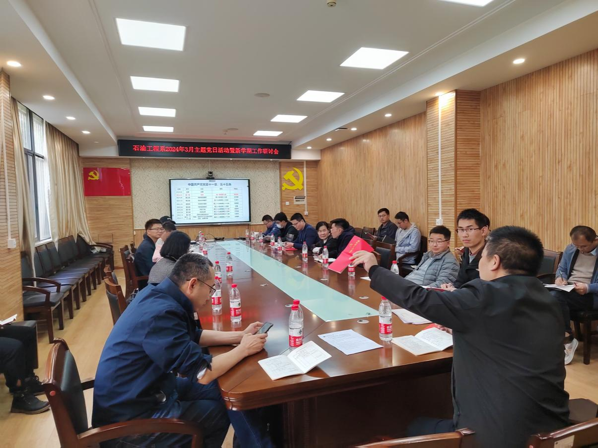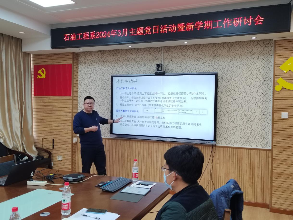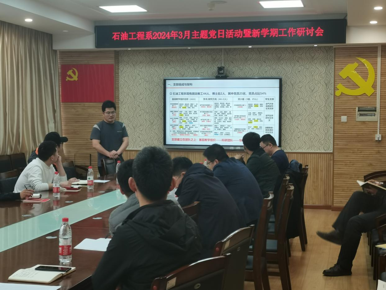 (通讯员 孙艳坤)3月28日,古天乐太阳集团城石油工程系党支部开展2024年3月主题党日活动和新学期工作研讨,会议主题为“学习全国两会精神,砥砺奋进担当作为——直面问题、勠力同心,推动石油工程学科建设”。石油工程系全体教师、学生党支部书记参加会议。支部书记张恒主持会议。