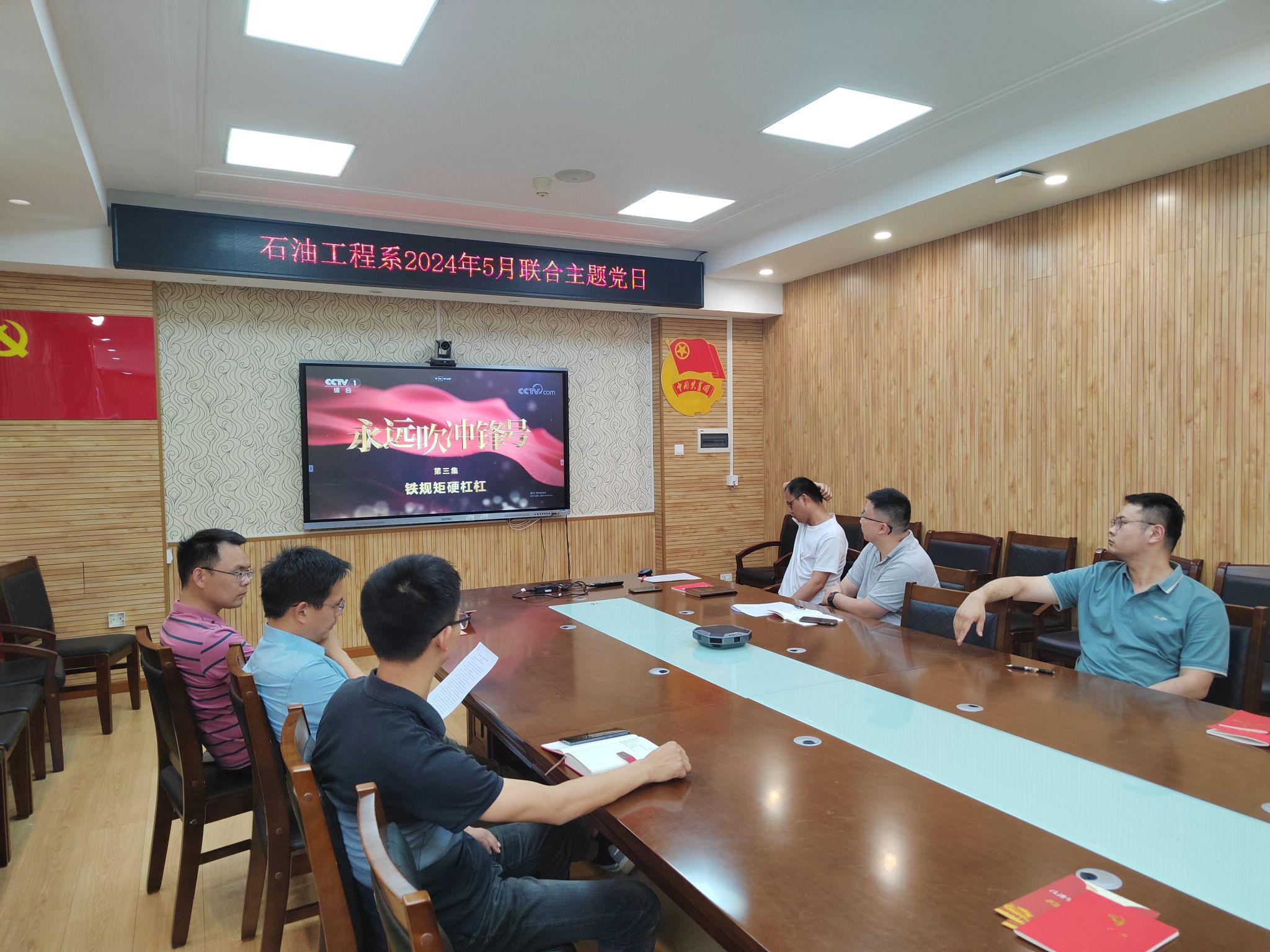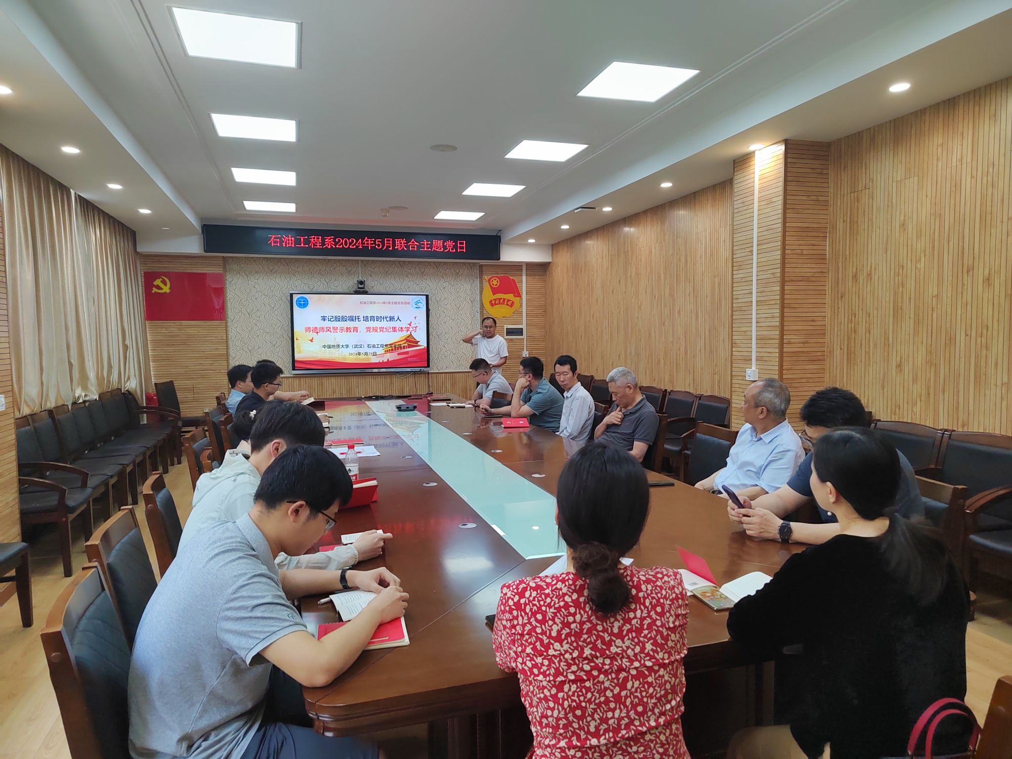 会议集中学习了习近平总书记五四青年节对全国广大青年寄语精神、习近平总书记对学校思政课建设作出的重要指示、《中国共产党党员网络行为规定》和《中国地质大学(武汉)师德师风教育应知应会》,教工党支部书记张恒同志领学《中国共产党纪律处分条例》,与会人员集中观看《永远吹冲锋号》第三集:铁规矩硬扛扛,开展党纪、师德师风警示教育。