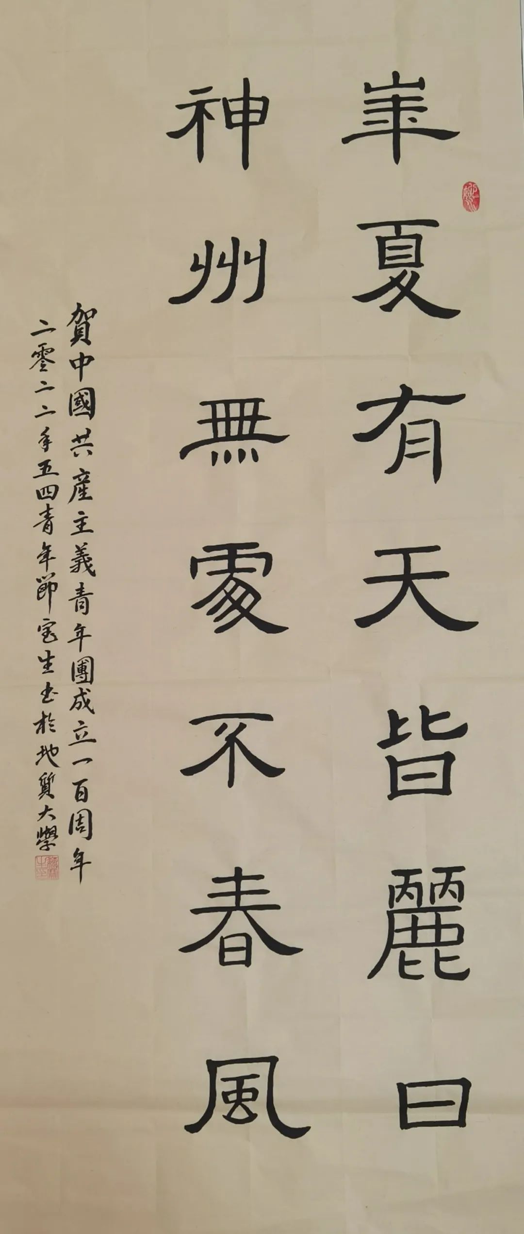 一个人要有足够好的爱国精神。今天是五四青年节,恰好也是建团一百周年纪念日。能以书画表达出对团的祝福,对党和国家美好祝愿感觉很青春。惟愿青年崛起担当,早日参与到国家建设中去。