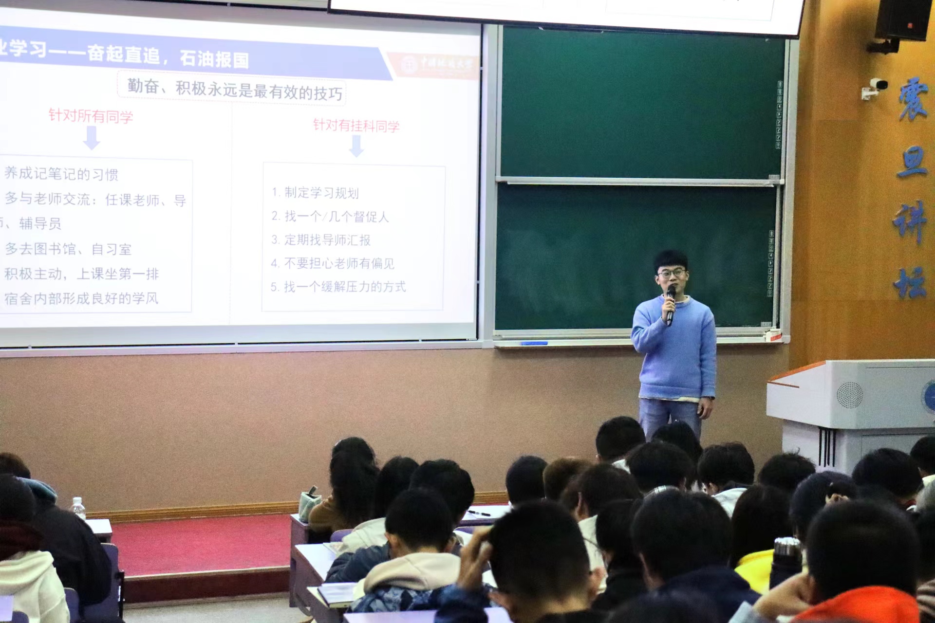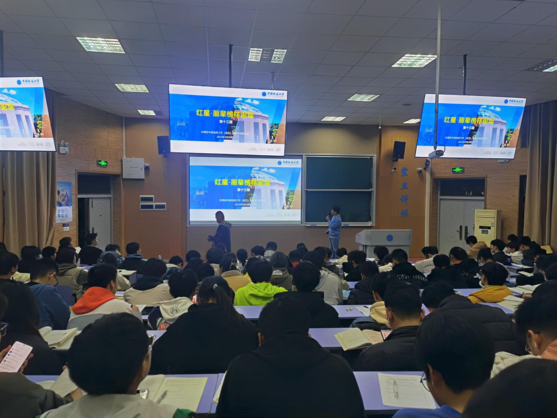 03月26日下午,古天乐太阳集团城第十三期红星·朋辈榜样论坛在教三楼110举行。辅导员刘明辉,石油工程系2022级研究生聂思嘉,2022级全体本科生参加。刘明辉主持。