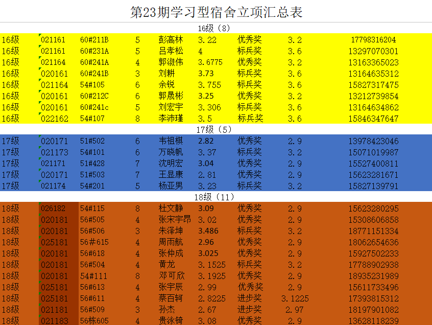 1.标兵奖:宿舍成员无挂科,大三大四年级平均绩点≥3.6,大一大二年级平均绩点≥3.2,人均奖励100元;