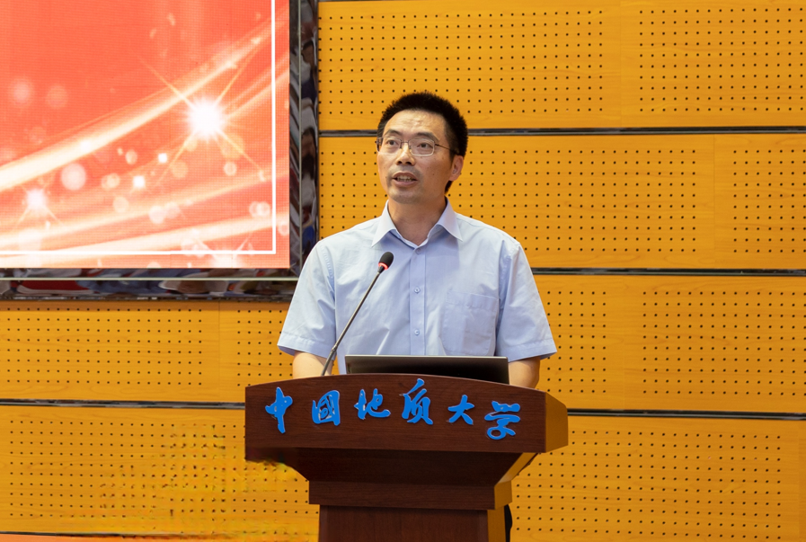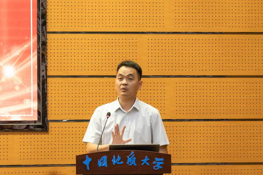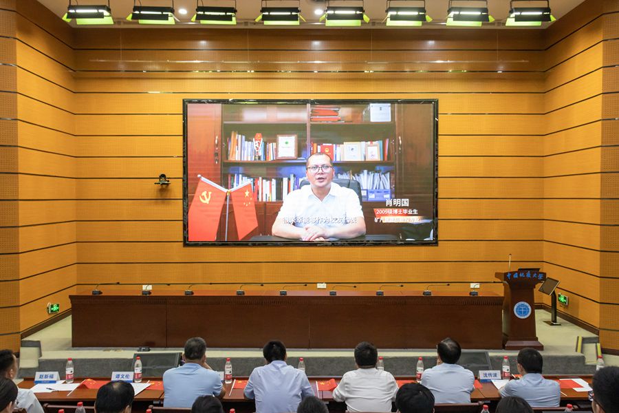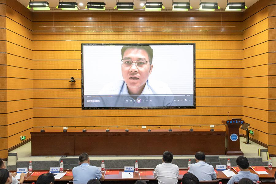 校友代表、国家矿山应急救援大地特勘队、中国煤炭地质总局北京大地高科地质勘察有限公司董事长肖明国通过线上方式来为同学们送上祝福。他深情回忆了自己在地大的求学时光,勉励同学们坚定理想信念,不忘地质报国初心和地大校训精神,千锤百炼铸匠心,争做地勘追梦人。