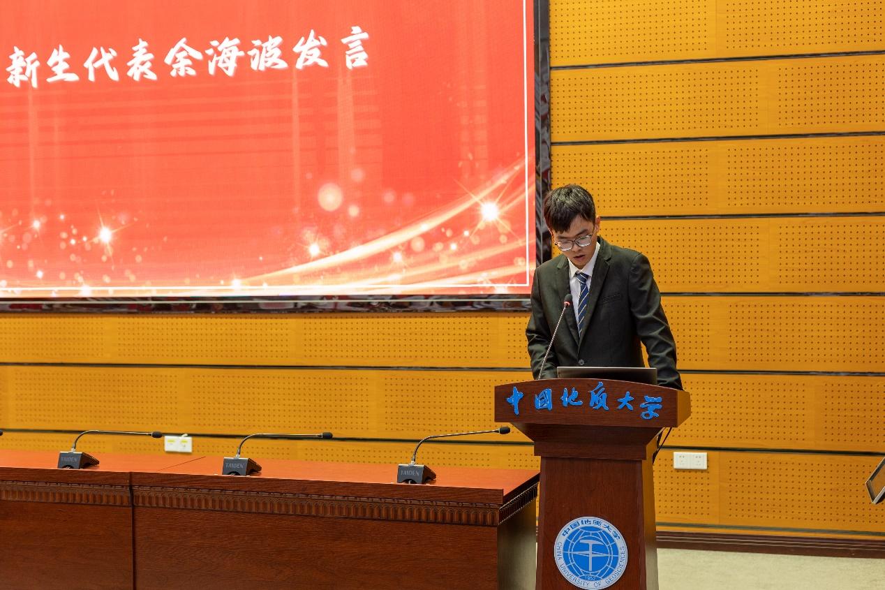 新生代表余海波同学发言。他倡议同学们要继承老一辈地大人、资源人的昂扬斗志,践行“艰苦朴素 求真务实”校训精神,把握好最美青春年华,用不懈努力在古天乐太阳集团城续写出最美的人生篇章。