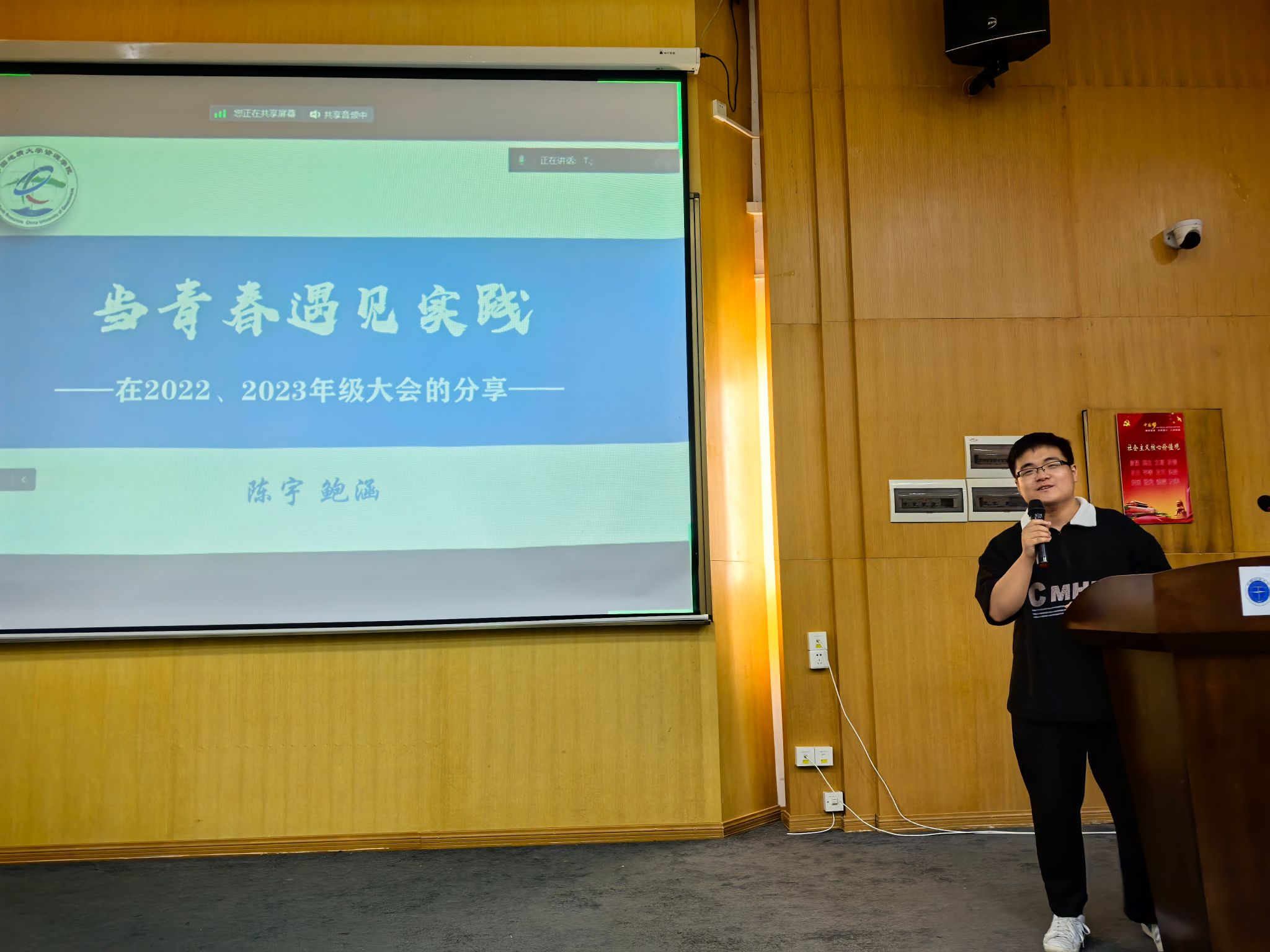 2023级学生代表敖扬洋作《别样的“武功”》安全主题分享。他分享了与朋友登武功山突遇强风大雨恶劣天气的短视频,提醒同学们徒步不是简单的打卡运动游玩,要做好充分的准备和预案,并增强实习期间的安全防范意识。