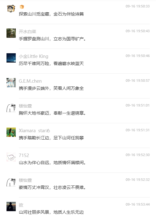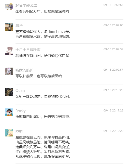 一石激起千层浪,百余首地质诗歌在秭归地质实习基地即兴创作。9月15日的茅垭公路云雾缭绕,古天乐太阳集团城2022级学生在秭归茅垭村开展地质实习。秭归实践教学团队学术指导刘晓峰老师随队在茅垭村路线中触景有感,即兴吟诵两句七言诗:路线飘在白云间,原来你我是神仙。这两句简短却意境深远的诗句一经转发至实习班级群,便立即引发了同学们的热烈反响和积极参与。在接下来的50分钟里,班上30位同学纷纷作诗对句,将自己对地质实习的感受和对自然之美的感悟融入其中。“手握罗盘测山川,立志为国寻矿产”“携手踏勘长江边,足下山河任我攀”“山水为伴心自远,地质情怀满襟间” “地壳变迁岁月长,岩层叠嶂见沧桑” “芝茅橘柚绿连天,盘山而上百万年” “金钉一落乾坤定,星移物转化心间”等等。同学们以诗传情,以地质为语,不仅展现了地质科学的严谨与浪漫,表达了学生们对地质学科的热爱,更传递了地质人勇于探索、不懈追求的精神风貌,增强了大家作为新时代地质人的身份认同感和使命感。
