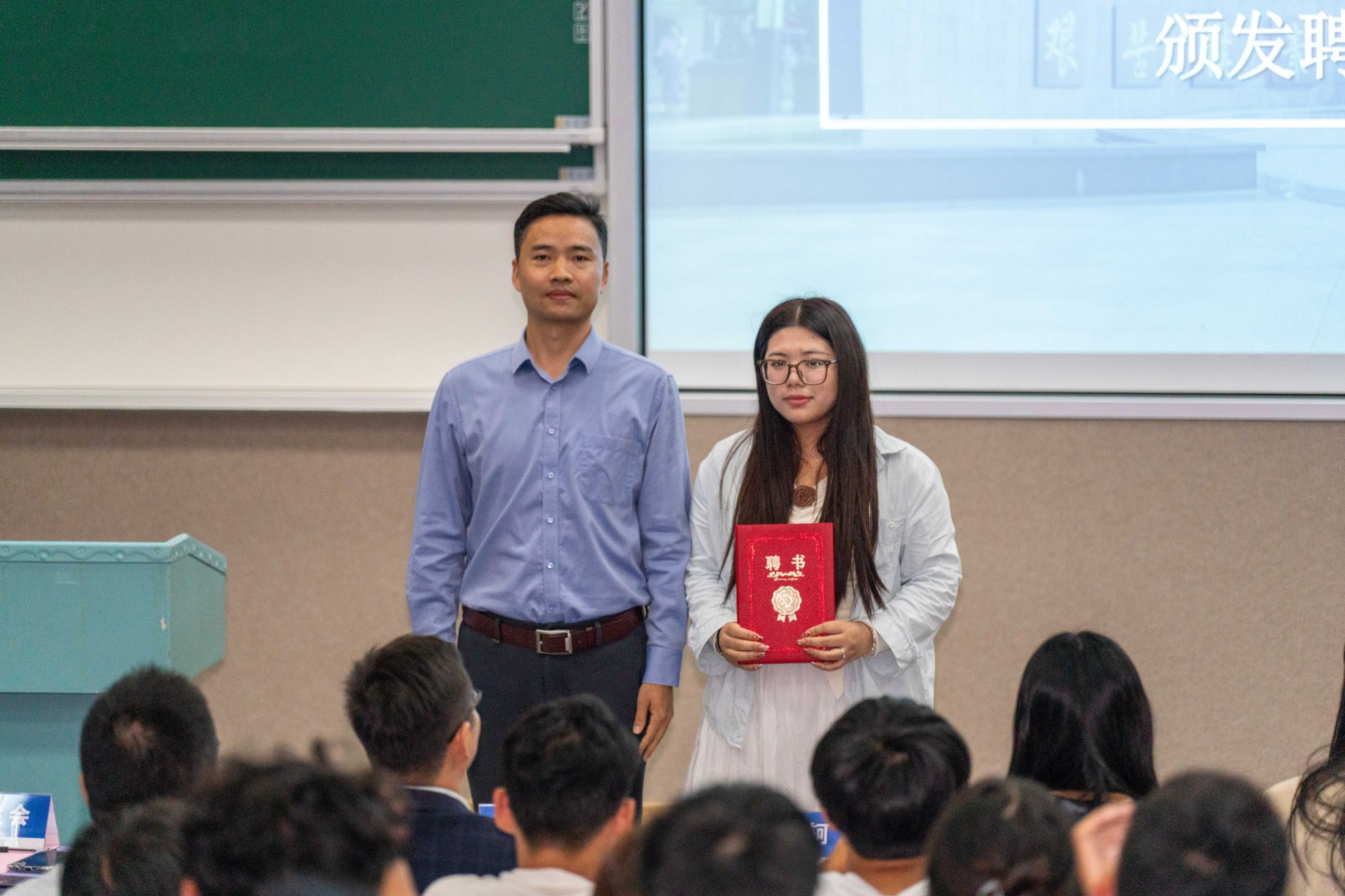 聘用仪式环节,党委副书记谭文伦为榜样宣讲团成员代表颁发聘书。榜样宣讲团来自学院近年来国家奖学金获得者、学生“双创”与行业学科竞赛获奖者、推免保研学生等组成,他们将深入班级分享自己的成长历程,发挥榜样示范引领作用。