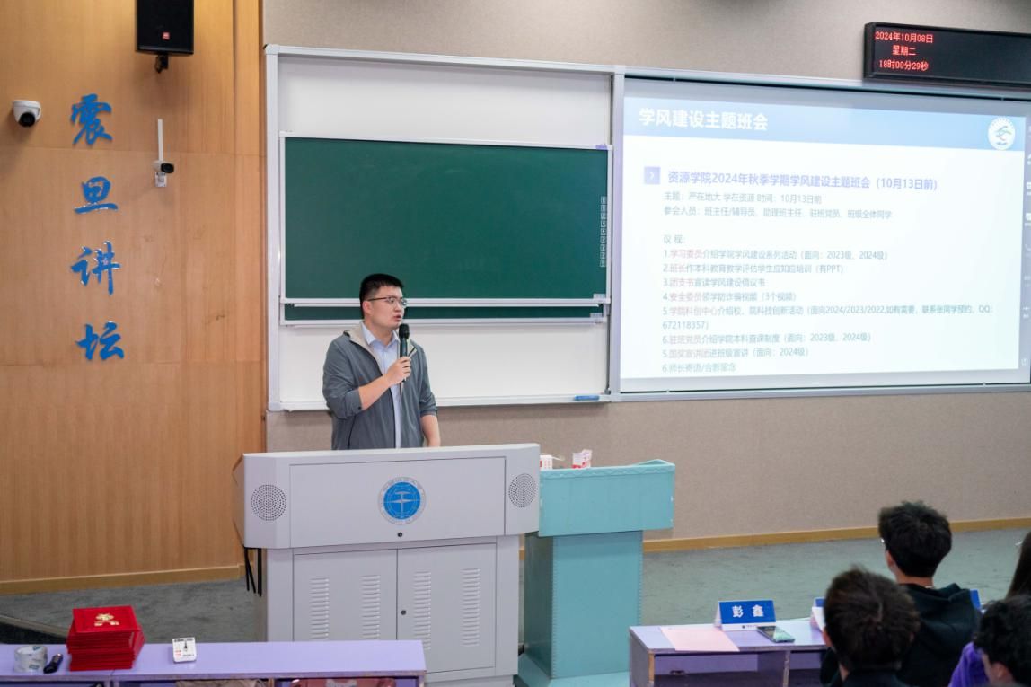 仪式最后,学院党委副书记谭文伦讲话。他表示,“严在地大,学在资源”是学院持续多年的学风建设品牌,希望同学们明确学习目标,养成良好习惯,自觉遵守校纪校规,以审核评估工作为契机,主动投入到优良校风学风的建设当中,以优异成绩迎接本科教育教学审核评估。