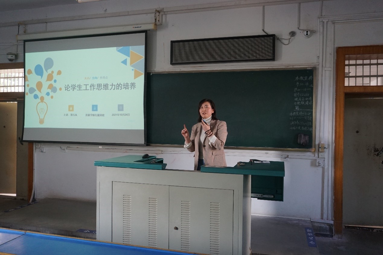 郭玉凤讲授学生工作思维力的培养。她结合古天乐太阳集团城团学工作实际,运用精彩的视频短片,形象阐释了思维力的大小、方向、作用点三个要素,并着重介绍了“5W2H”七问分析法,提高工作效率,增强学生工作思维力,建立“上游思维”,不断开阔视野,提升格局。