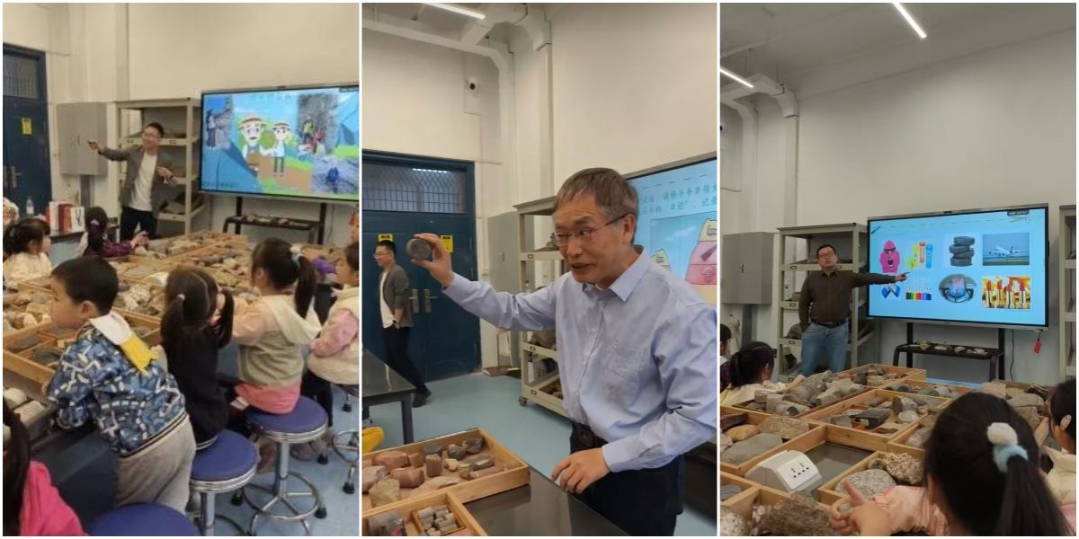 在活动中,老师们以多样化的形式带来了一场生动有趣的科普盛宴。在"化石探秘"环节中,小朋友们手握专属的三叶虫化石纪念品,仔细观察古生物化石纹路。王维老师通过视频演示和实验操作,生动地讲解了沉积岩的形成过程,带领小朋友们观察三叶虫化石的特征,让小朋友们直观感受到远古生命的神奇。杨香华教授则以沉积岩的颜色与特征为主题,通过实物展示和互动问答,介绍石头的不同形态与故事。权永彬老师则用通俗易懂的语言,介绍了石油的用途及其形成过程,让小朋友们明白石头中蕴藏着“黑色的金子”,并感受到自然资源的重要性。支部书记胡守志老师全程参与活动,与小朋友们亲切互动,耐心解答他们提出的问题,小朋友们热情参与,现场氛围热烈而温馨。