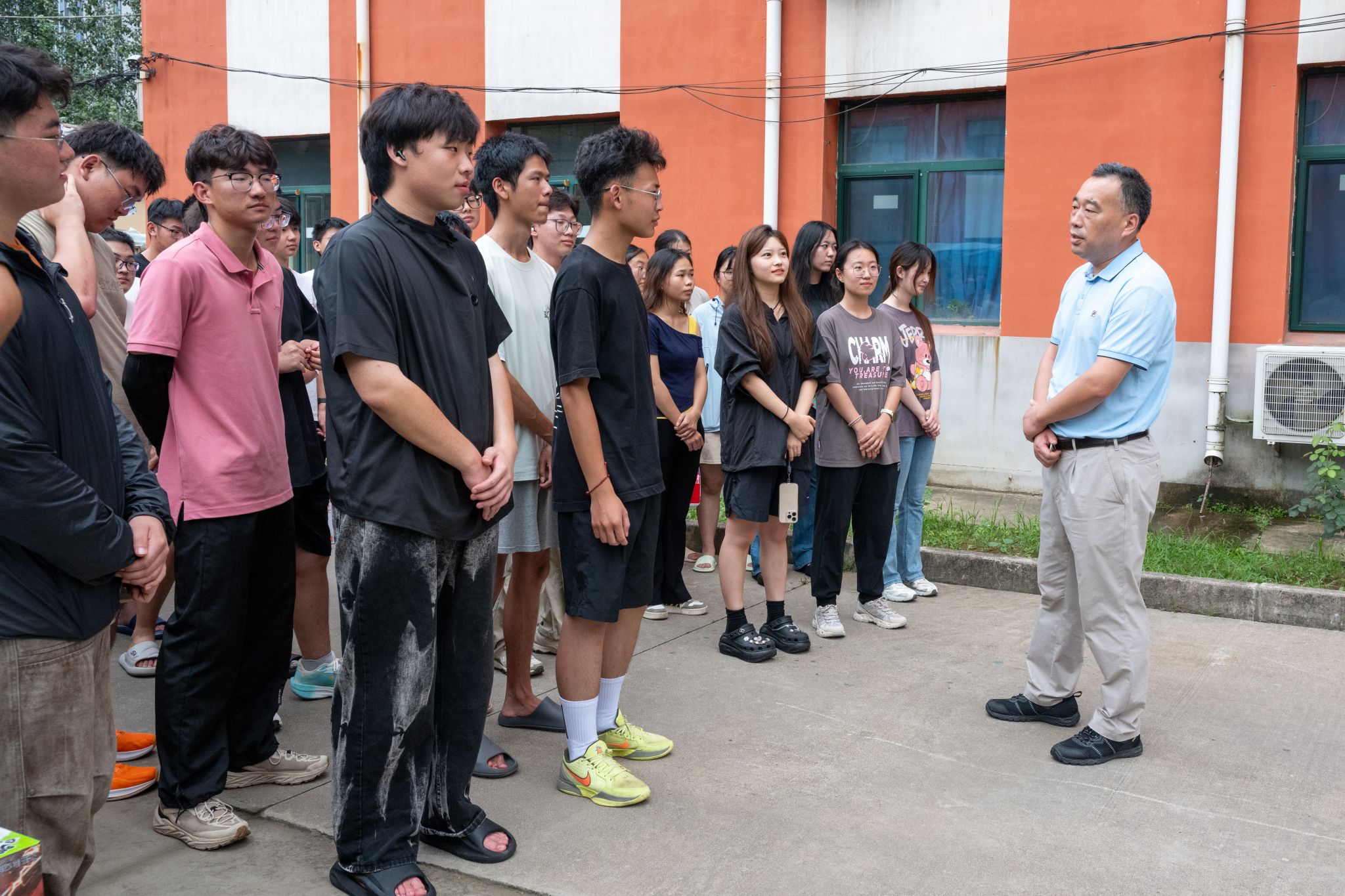 在学生公寓门前,他关切询问了同学们的实习体验与收获,并结合野外地质实习特点,寄语同学们:要高度重视地质实习,提前预习线路内容,在野外实践时和课本上所学的理论知识相结合,规范锻炼地质技能,认真记录野簿,并且在实习的过程中,养成地质思维,将个人专业所学所长同与国家战略需求紧密结合,与国家发展同频共振。随后,他为同学们发放了消暑慰问品。