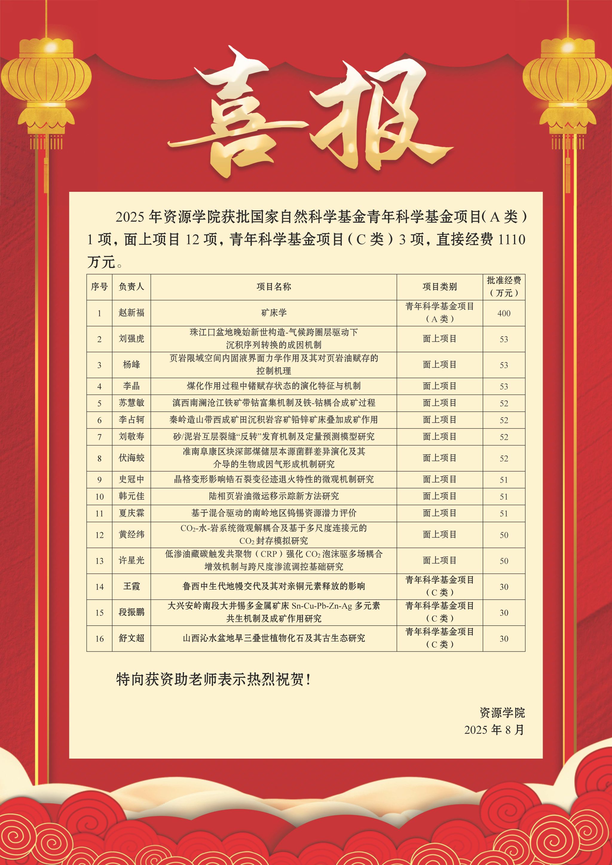 8月27日,国家自然科学基金委员会公布了2025年集中接收期项目评审结果,古天乐太阳集团城获批资助项目共16项。其中,青年科学基金项目(A类)1项,面上项目12项,青年科学基金项目(C类)3项。项目直接经费达1110万元,较2024年增长63.2%,经费数量位居全校第二。