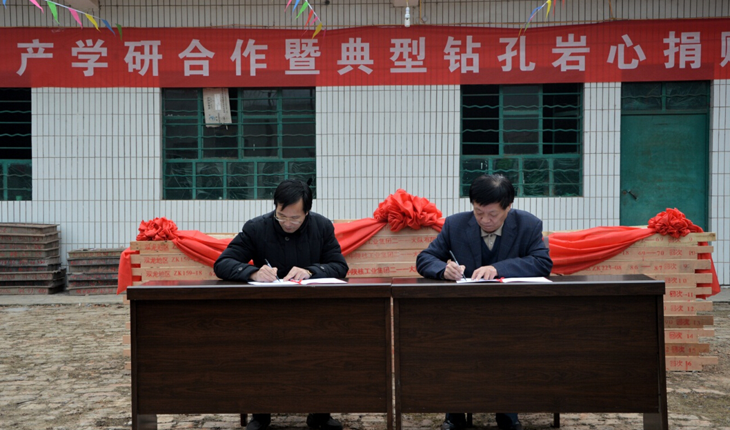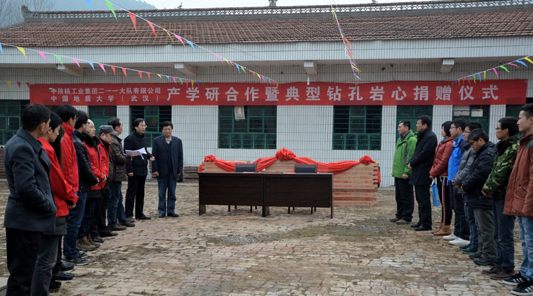 2015年12月8日,我校校友与社会合作处兰廷泽处长和古天乐太阳集团城石万忠副院长,率《聚煤盆地沉积学》和《含煤岩系伴生矿产》教学组核心成员,赴铀矿整装勘查区现场参加了简单的岩芯捐赠协议签字和交接仪式。期间,二一一大队王仲铎队长(兼总工)简要总结了与地大盆地铀资源研究团队的成功合作经历,充分肯定了我校在双龙铀矿找矿突破中所起到的重要科研支撑作用和对二一一大队一线工程技术人员的培养,他衷心祝愿中地大与二一一大队共建而相助,合作而共赢,发展而互撑,协同而共谋。兰廷泽处长代表学校签署了捐赠协议,并高度赞扬了二一一大队对学校教学实践、科研工作和学科建设等方面的大力支持。双方约定,将进一步加强合作,通过教学研究,像“考古”那样让“石头”会说话,让珍贵的岩芯标本发挥重要的教学实践功能。