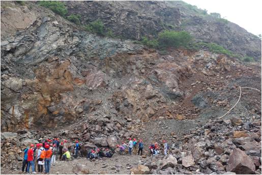 大冶铁矿是我国著名的矽卡岩型铁铜矿床,开采历史悠久,已经建成我国首座国家矿山公园,具有优越的矿床地质学习资源,是专业实践的理想场所。本次实践教学由毕诗健队长带队,皮道会和曹晓峰副教授担任现场教学指导。实践教学以认识矽卡岩型铁矿床地质特征为目的,围绕接触带、矿体、矿石、蚀变等知识点展开。通过本次实践教学,一方面加深了学生对专业知识的理解,另一方面培养了学生观察和描述能力,锻炼了学生矿床学思维。