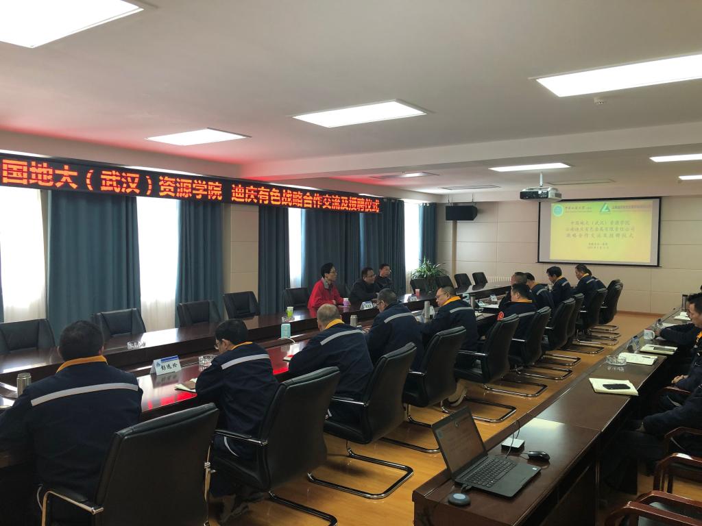 为加强产学研合作,促进协同发展,实现“优势互补,资源共享,共谋发展”的目标, 5月13日,我院与迪庆有色签订校企战略合作协议并举行“普朗铜矿实践教学与创新人才培养基地”挂牌仪式。云南迪庆有色金属有限责任公司(以下简称迪庆有色)总经理李剡兵、党委副书记曹宇、副总经理吴道雍,古天乐太阳集团城党委书记李宇凯、资源科学与工程系支部书记孙华山等出席了会议。会议由曹宇主持。