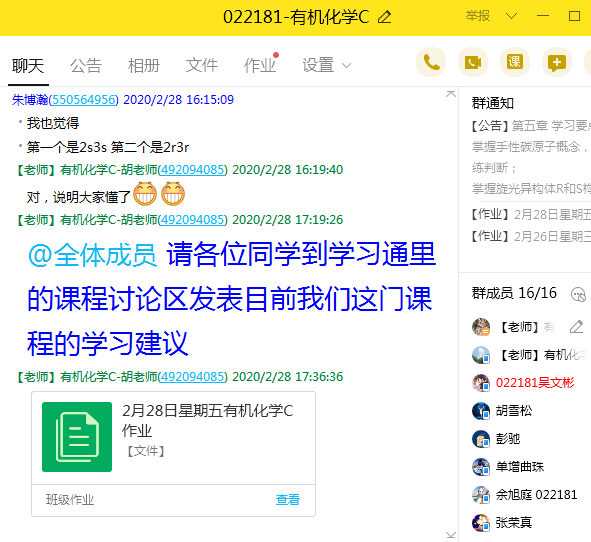 石油地质系胡守志老师,作为石油地质系教工支部书记,积极响应“停课不停学”的要求,克服种种困难,借助超星学习通和QQ群实现了《有机化学C》课程的网络教学。由于家里唯一的电脑女儿白天上课要使用,胡老师只能晚上提前录好速课视频,并在白天利用手机上课。针对该课程作业在PPT上不好讲解的问题,胡老师利用父母家居住在校园内的便利,借用一间小学教室,让自己的爱人帮助录了一次作业讲解的直播,解决了学子们学习上的疑惑。