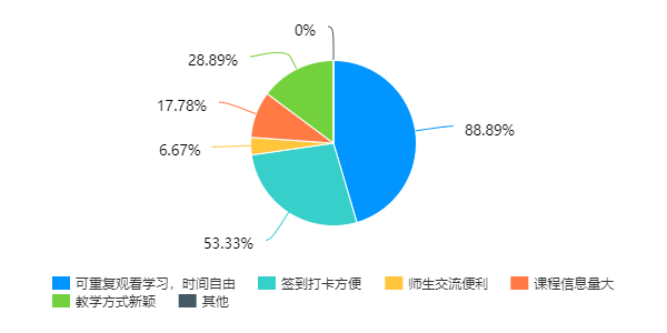 从与线下课程的比较来看,88.89%的同学认可线上课程在“可重复观看,时间自由”比线下课程更具有优势,而超过半数的同学认为线上课程签到打卡方便,还有少部分同学认为师生交流便利、课程信息量大以及教学方式新颖也是本门网课的优点所在。不过,也正是因为课程信量大,有82.22%的同学同时认为该网课重点太多难以消化,同时有近一半的同学认为软件使用不太方便,而且由于内容太多很难及时收到学习成果的反馈。此外,还有同学写道,电子版的教材使用依旧逊色于实体教材,而自己有什么问题也无法和老师及时沟通,若是在学校可以当面问老师。也有极个别同学反映自己的网络状态不稳定,如果卡顿了一会之后很难再接续上思路,只能靠自己摸索,同时签到系统偶尔也会出bug,明明签到了却显示没有签到。