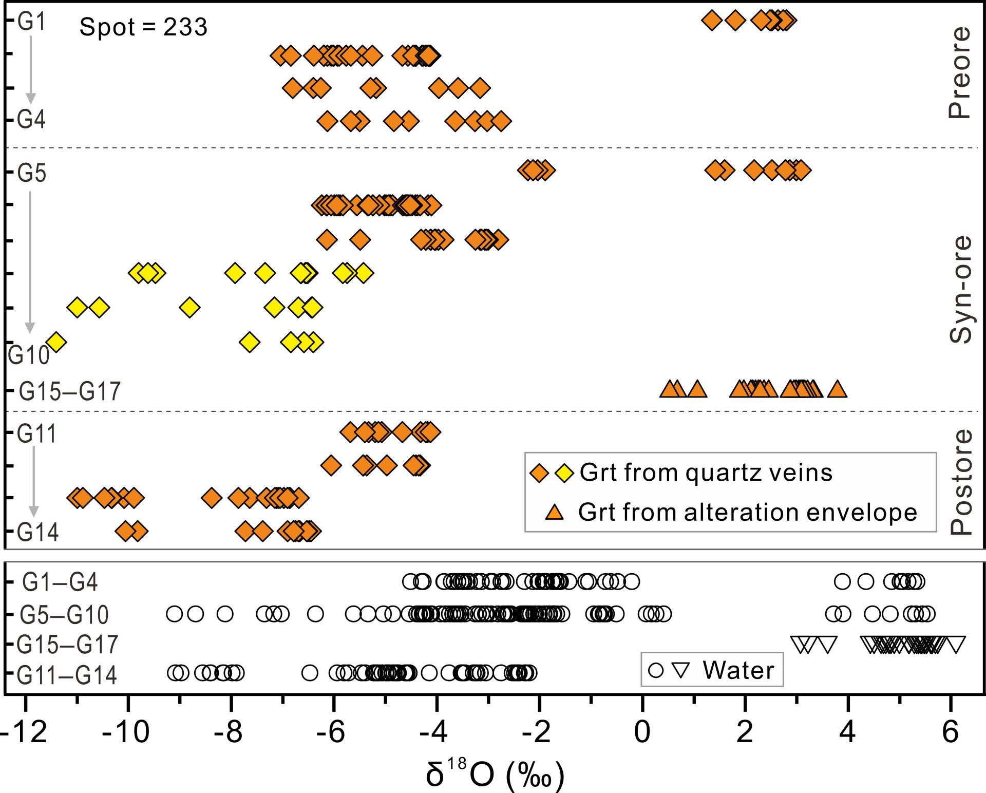 2.各成矿阶段的石榴石(上)及与之平衡的成矿流体(下)的氧同位素组成。Preore, Syn-ore, Postore分别表示成矿前期、主成矿期和成矿后期。G1~G17表示石榴石矿物颗粒编号