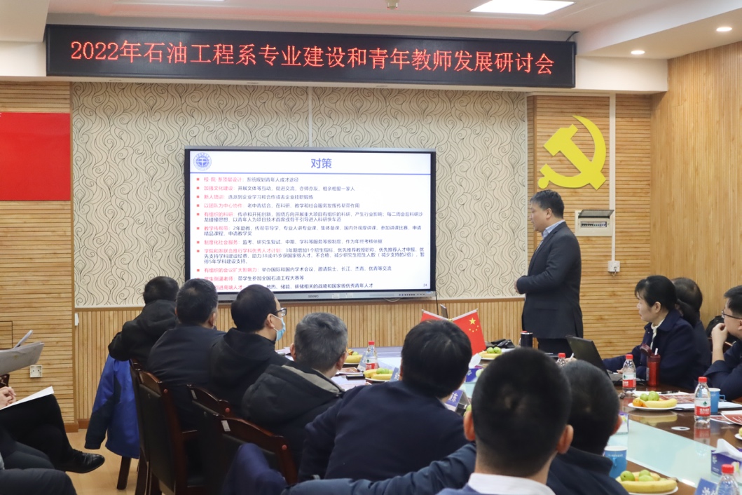 系主任蒋恕教授介绍石油工程系的系情,通过国内外师资、科研、教学、人才培养的对比,总结了海归青年占比高、地质工程一体化和油藏模拟和智能决策特色及科研论文质量高等优势,建议未来在新能源、储能和碳储等方面作为学科重点发展方向,加强一流专业建设,推进新工科建设,改善教育教学条件,提高人才培养质量;同时,提出努力让青年教师尽快适应有组织科研,积极参与专业建设,认真承担教育教学,对标“四有”教师标准加强师德师风和执教能力建设。