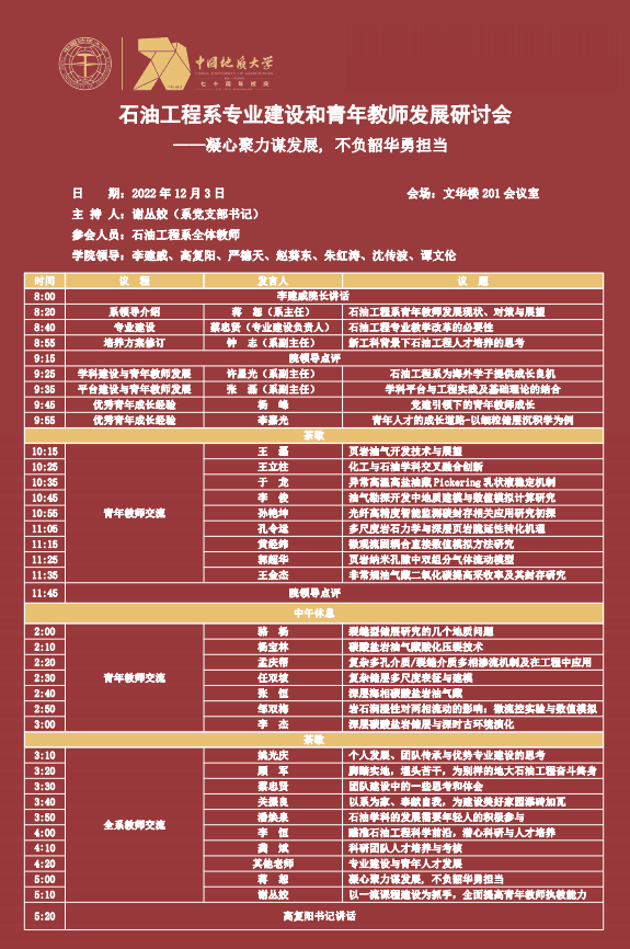 教授委员会踊跃发言。姚光庆教授讲到,团队是加油站,95年专业建设,到2025年迎来创办30周年,需要努力朝着创名牌优势专业的方向建设,引进人才要雨花学科背景和知识结构,补过去短板强前沿优势,做到“名特优”;顾军教授分享自身基层经历,指出年轻教师脚踏实地克服生存难的问题,鼓励大家不要气馁;蔡忠贤教授强调团队建设的重要性和团队负责人需要努力具备“创品牌特色、把握前沿方向、获取项目能力、协调组织管理能力、经费分配能力、推进成国建设、营造正能量的氛围”等6项能力;关振良教授讲到,各位老师要以系为家、拥有认同感大局观,相互理解包容,充分利用公共平台,减少内耗,要有集体荣誉感;潘焕泉教授分享从回国以来的感受,讲到人才政策职称快速晋升通道成长对青年教师的利与弊,提醒各位老师要调整心态、增加行业曝光度,要去适应横向项目;李恒教授以自身视角对石油工程学科前沿进行了诠释;龚斌教授讲到在传统的油藏开发模式下,地质建模软件与油藏数值模拟器至关重要,将是我们实现技术突破并超越西方,打破西方技术垄断的重要契机。
