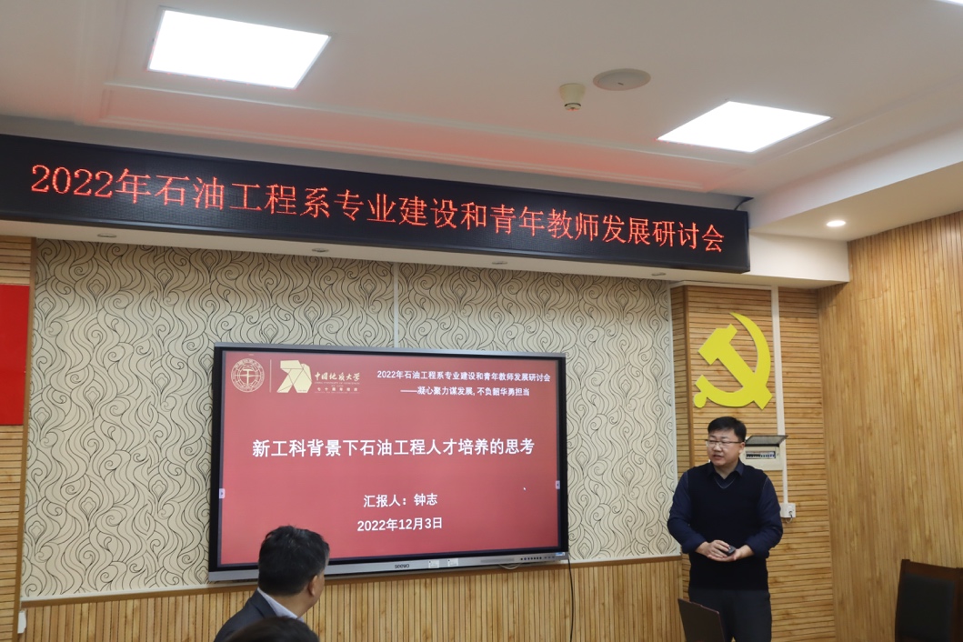 系副主任钟志特任教授就本科人才培养方案修订和新工科背景下石油工程人才培养作了专题发言,也分析了自己融入团队并在团队帮助下找准研究方向和顺利拿到国家自然科学基金项目。