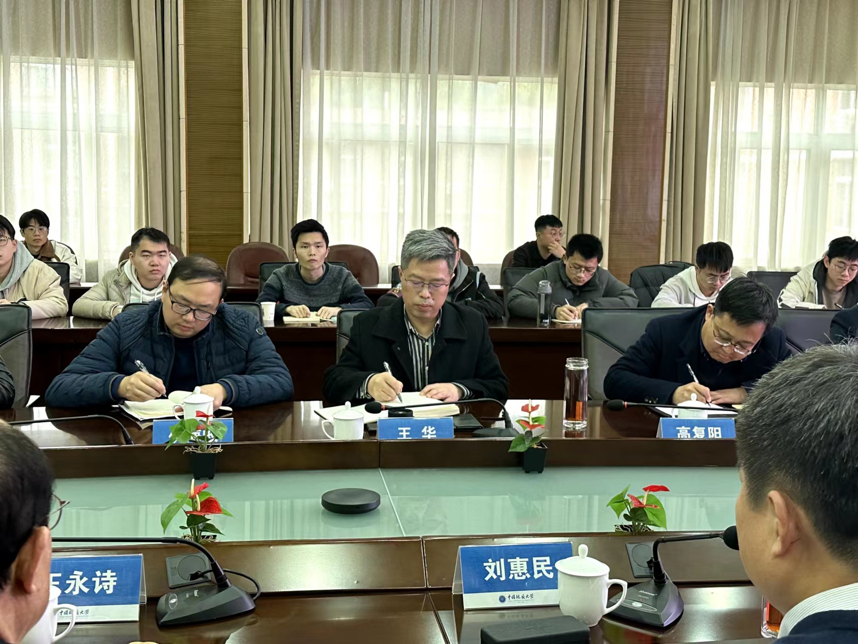 王华对刘惠民一行来校调研表示欢迎,并从师资队伍、学科方向、科学研究、科技创新平台、国际合作等方面介绍学校整体情况。他感谢胜利油田长期以来对学校全方位的大力支持,希望双方深化战略合作,创新合作模式,在服务“百年胜利”建设的同时,推动学校高质量发展。
