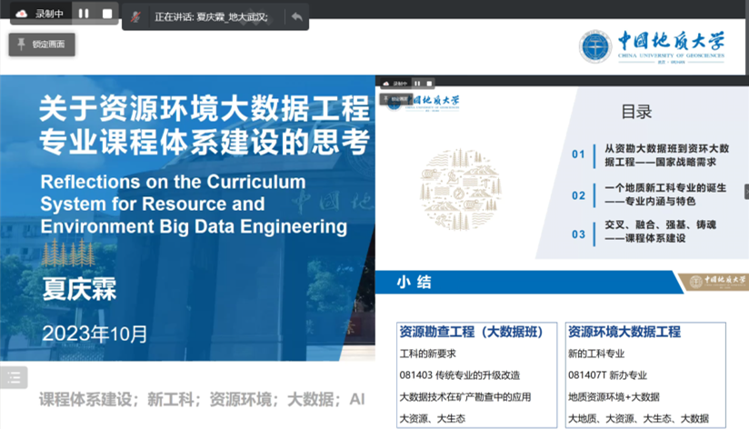 (通讯员 陈志军、陈鑫)10月27日,资源勘查课程教育部虚拟教研室邀请了教育部高等学校教学指导委员会地质类专业教学指导委员会秘书长、中国地质大学(武汉)古天乐太阳集团城夏庆霖教授作《关于资源环境大数据工程专业课程体系建设的思考》的报告,开展线上教研活动。中国地质大学(武汉)、长安大学、成都理工大学、山东理工大学、山东科技大学、新疆大学、长江大学等十余所高校师生参加了会议。会议由虚拟教研室负责人中国地质大学(武汉)吕新彪教授主持。