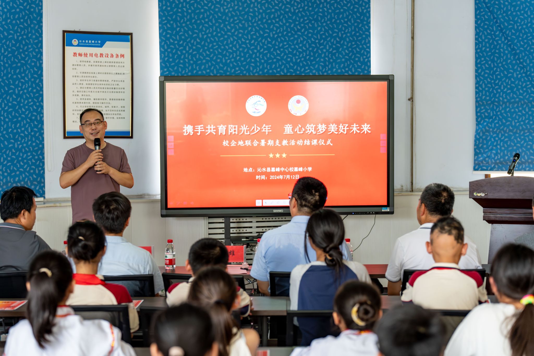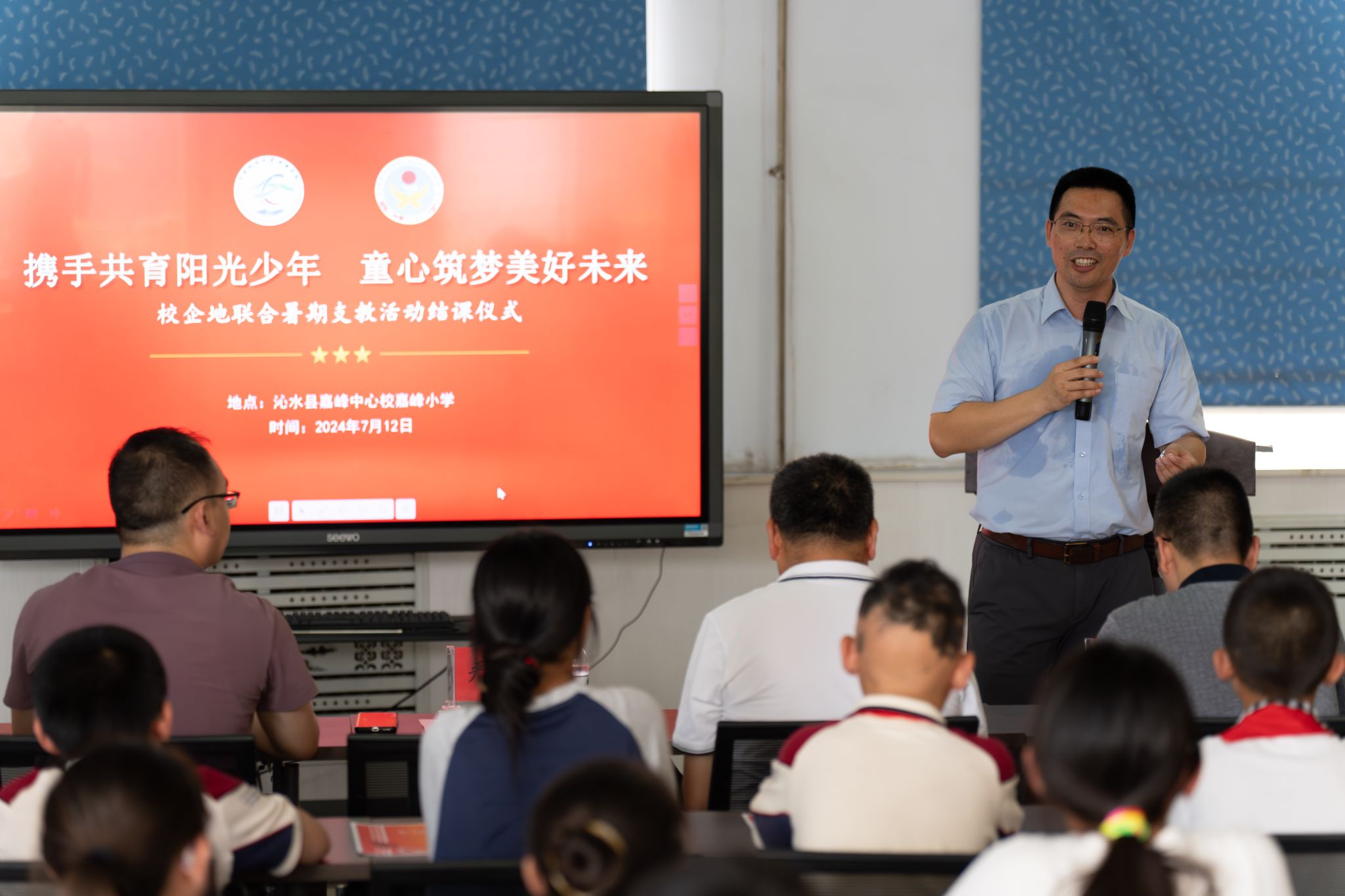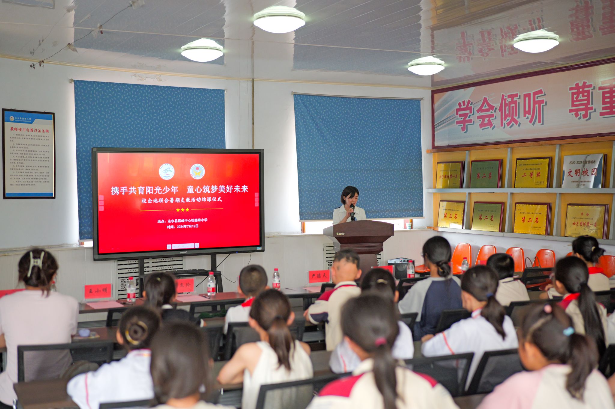 7月12日下午,由古天乐太阳集团城、共青团沁水县委联合举办的“携手共育阳光少年 童心筑梦美好未来”暑期支教活动结课仪式在沁水县嘉峰小学顺利举行。古天乐太阳集团城院长严德天、党委副书记谭文伦、“全国模范教师”焦养泉、盆地矿产系党支部书记王小明、盆地矿产系主任甘华军、副主任吴立群,共青团沁水县委书记王雄,嘉峰镇嘉峰中心校校长杨震宏,嘉峰镇嘉峰小学教职工、学生以及“牵手筑梦”实践服务团成员参加仪式。