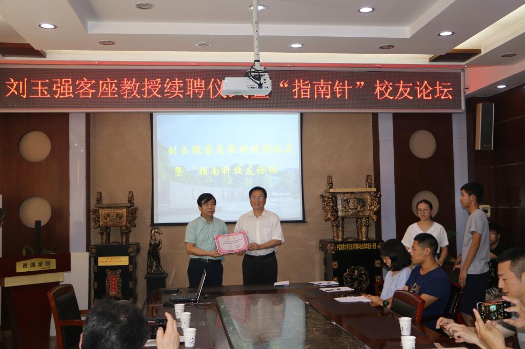 续聘仪式结束后,刘玉强教授做客“指南针”论坛,与师弟师妹共话成长。他以自己工作的经历为主线,勉励师弟师妹们树立信心,热爱专业,努力钻研,敢于吃苦,勤于干事。他指出,地质专业是我校一流学科,前途光明,事业伟大,只要肯投入,有毅力,就一定会有成就。