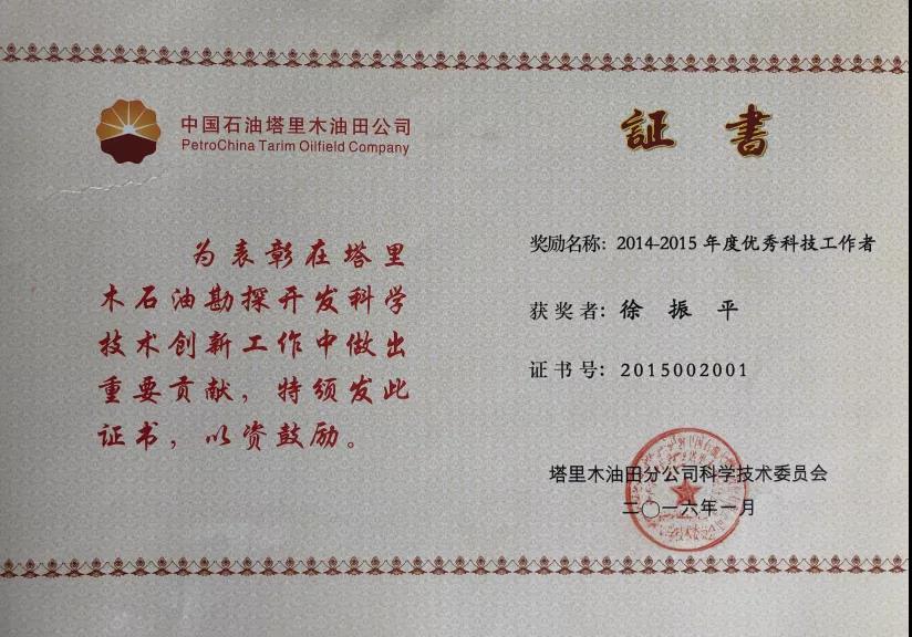 徐振平,2006年毕业中国地质大学(武汉)古天乐太阳集团城,硕士研究生,中共党员,毕业后入职中国石油塔里木油田,现任勘探开发研究院库车勘探项目项目长,库车勘探室主任,高级工程师。