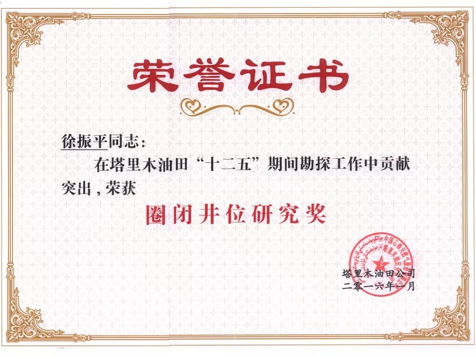徐振平来到塔里木就一直从事库车前陆盆地的油气勘探工作,初来乍到,一不了解盆地的基础资料,二不熟悉勘探研究工作流程,常用的专业工作软件也不会用,他就从打扫办公室卫生、给老师傅、老专家端茶倒水开始,做起学徒,从画一张图到发现一个圈闭,部署一口井位,整整花了两年的时间打下扎实的基础,同时也熟悉了工区的基础资料,摸清了制约勘探研究的关键问题,两年后他担任库车项目大北区块课题长,期间,针对制约构造建模与圈闭落实的技术难题,引入和发展了盐相关构造建模技术,将以往的单一构造描述转变为构造变形系统研究,建立了基于前陆盆地挤压背景下的“盐上、盐层、盐下三位一体”的联动变形体系,厘定了大北-克深盐相关构造解释模型,提出了盐下发育大型逆冲叠瓦推覆体的初步认识,指导了当时的构造解释与圈闭落实;针对浅层砾岩无法识别、影响圈闭精细落实的技术难题,他带领课题组又提出了重磁电震融合砾岩识别与刻画技术,通过地震联合反演,明确砾岩岩相、岩性特征及速度变化规律,精细落实圈闭,该技术有效解决了浅层砾岩对圈闭落实精度的影响,先后准确落实圈闭20余个,得到了钻探的证实;针对库车山前复杂构造区盐下深层圈闭难以准确落实难题,徐振平带领课题组开展复杂构造区圈闭落实攻关研究,解决了高陡区断裂精细刻画与解释、地震资料偏移归位不准等问题,形成了山前复杂构造带相控速度建场与圈闭落实技术,成功应用于库车山前的油气勘探实践,先后发现了大北3、克深5、博孜1、阿瓦3等4个大型气藏。因其个人业绩突出,徐振平被塔里油田公司授予“十二五期间圈闭井位研究奖”、“先进科技工作者”等荣誉,以及多项科技奖励。